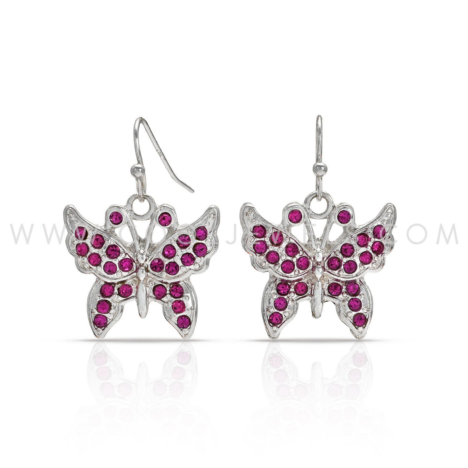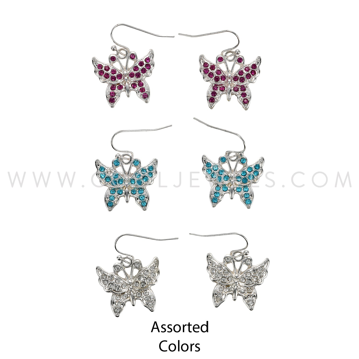 These Assorted Blue & Pink Rhinestone Butterfly Earrings feature a silver butterfly accented with rhinestones.