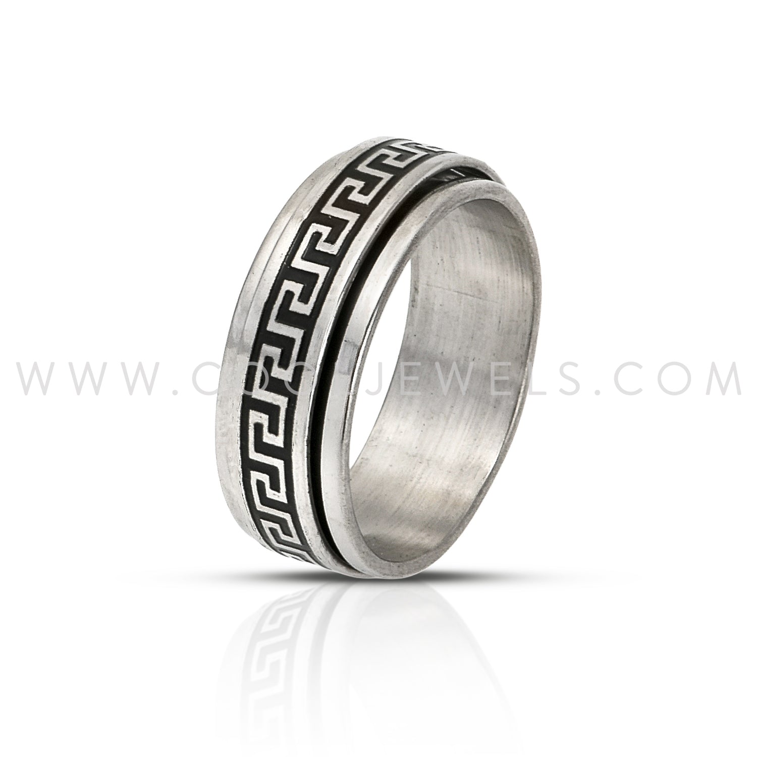 These Stainless Steel Spinner Ring features a stainless steel ring with a geometric shape pattern.