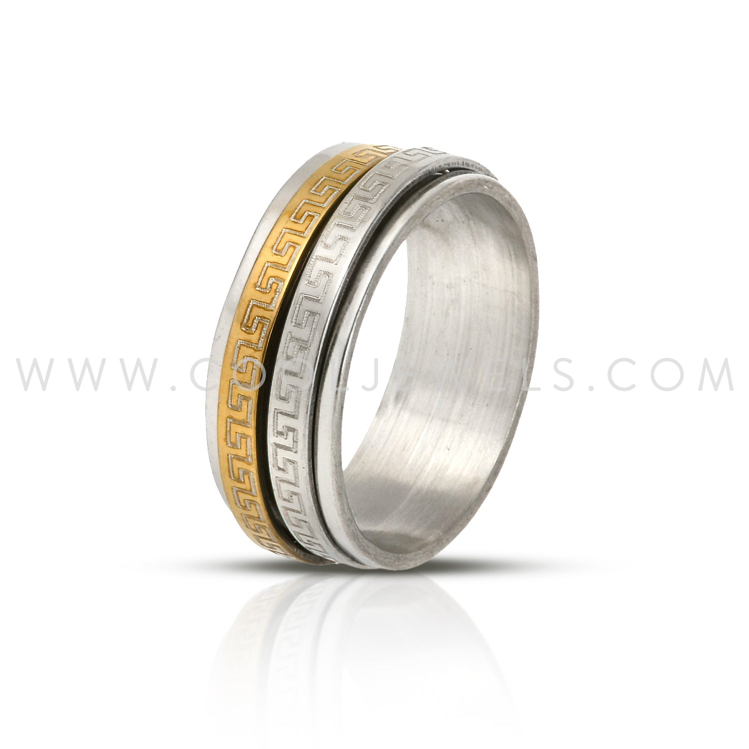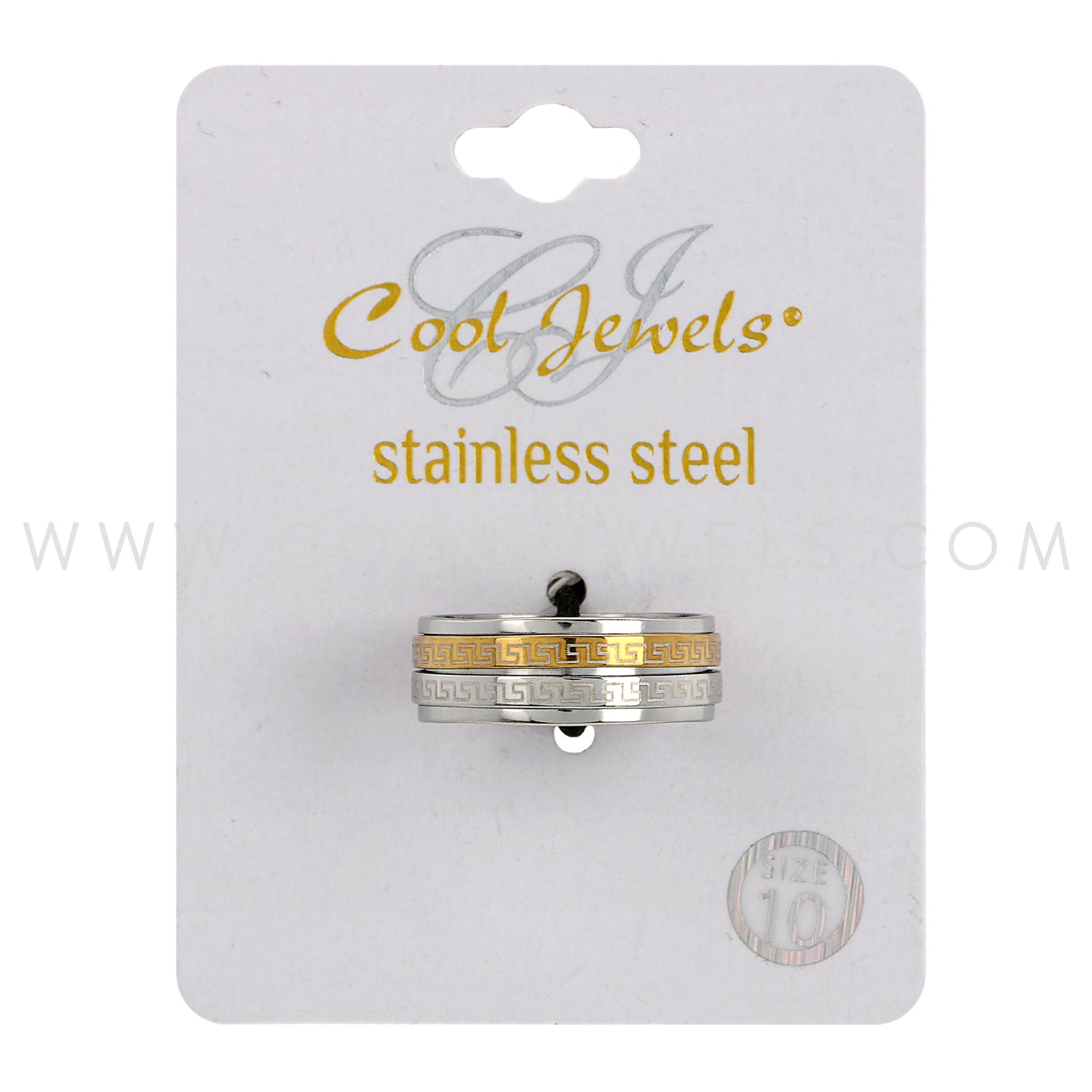 These Stainless Steel Double Spinner Ring features a stainless steel ring with a geometric shape double spinner, one gold and one silver.