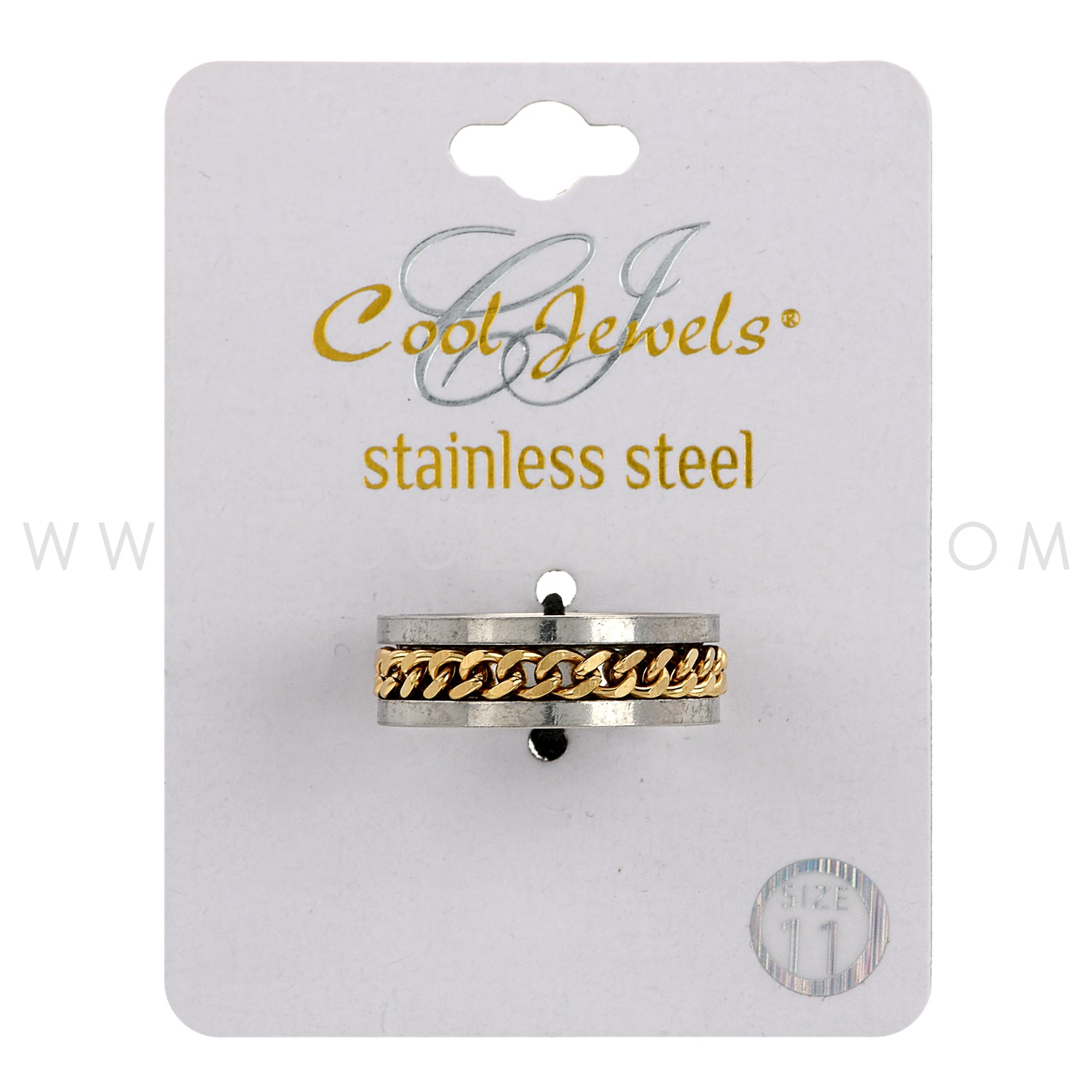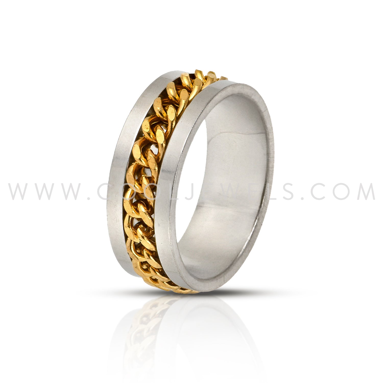 These Stainless Steel Gold Chain Spinner Ring features a stainless steel ring with a gold chain spinner.