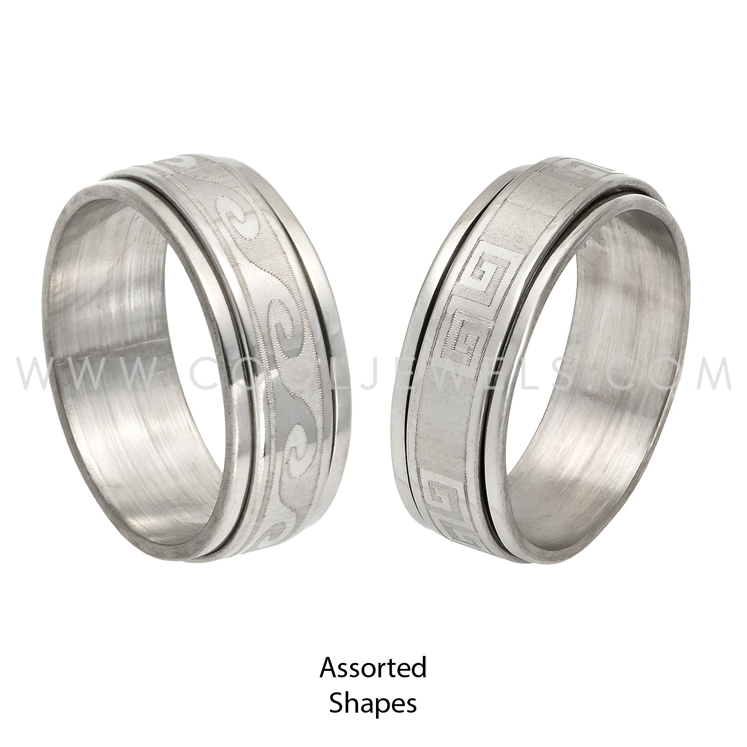 These Assorted Shapes Stainless Steel Spinner Rings features a stainless steel ring with a variety of different shapes and patterns that spin.