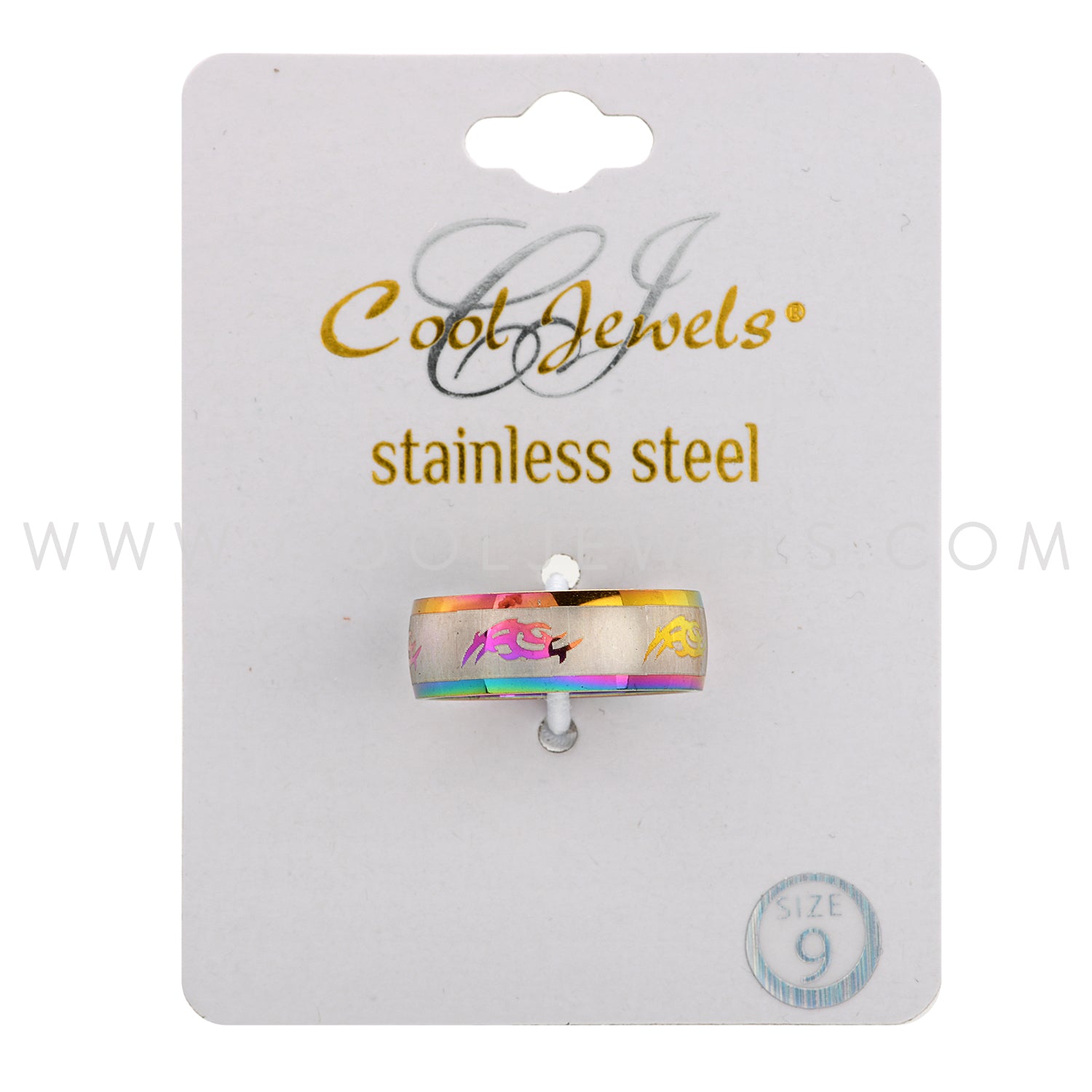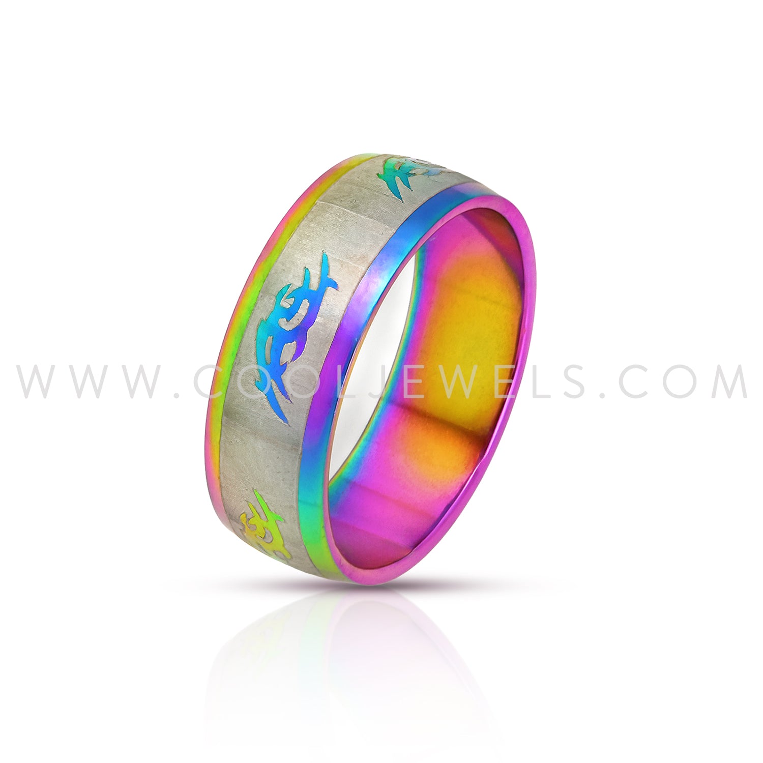 These Rainbow Tribal Design Stainless Steel Rings come with a rainbow tribal design with rainbow accented edges.