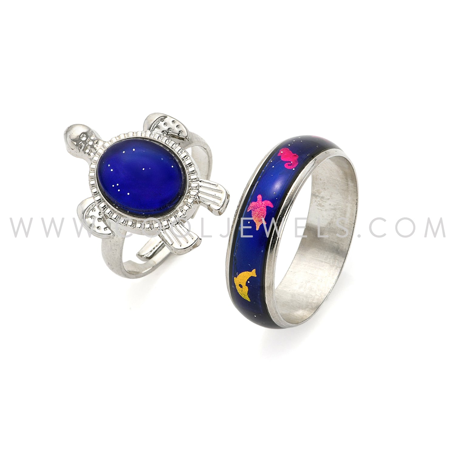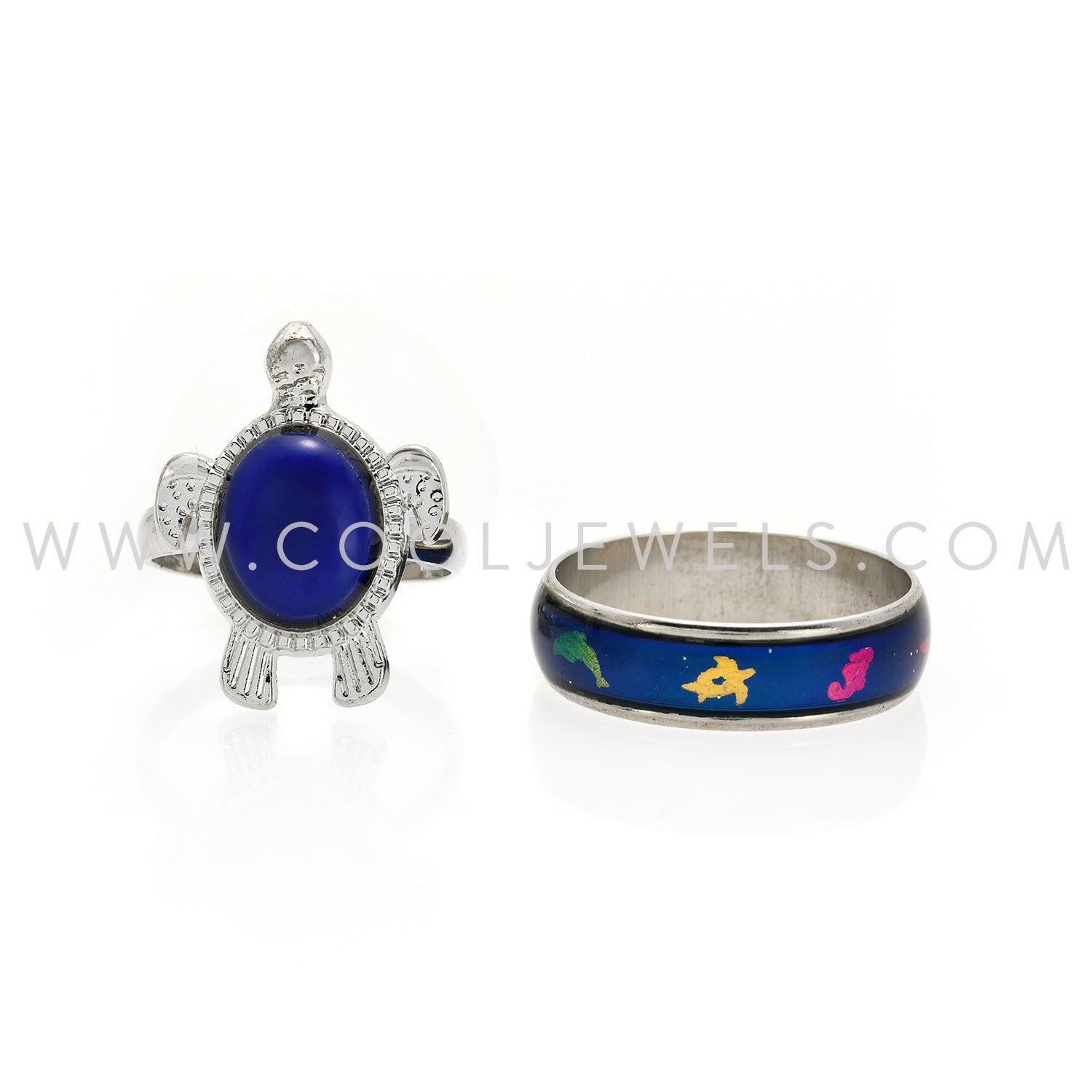 These (Set of 2) Color Changing Mood Sea Life Rings features two rings - one mood silver turtle ring, and a second mood ring with different sea life.