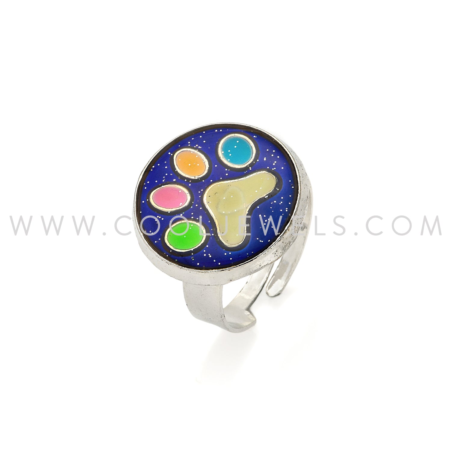 This Bear Paw UV MOOD Ring comes individually carded within each dozen set and features a UV color changing Bear Paw Print with a heart in the center and a glitter MOOD background.