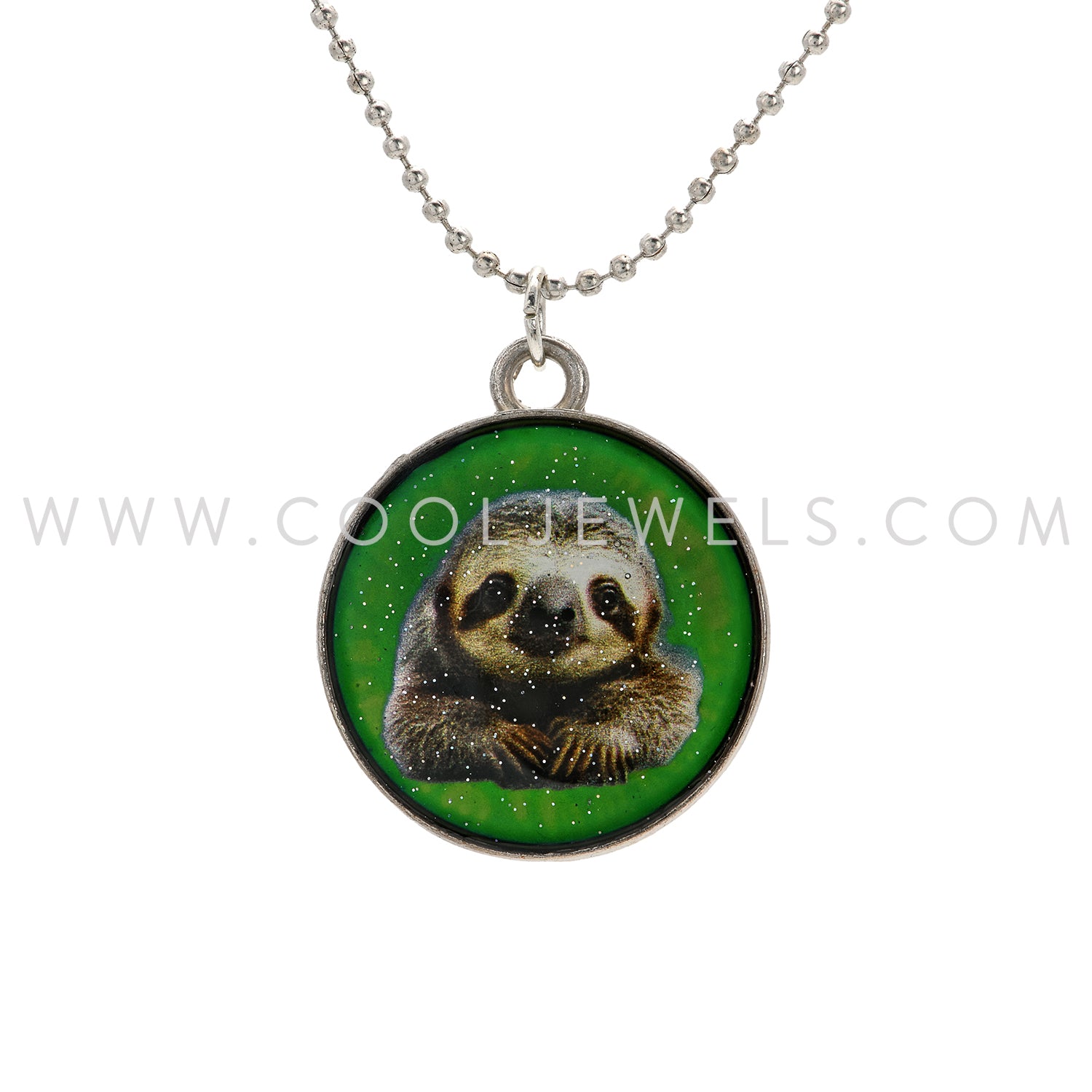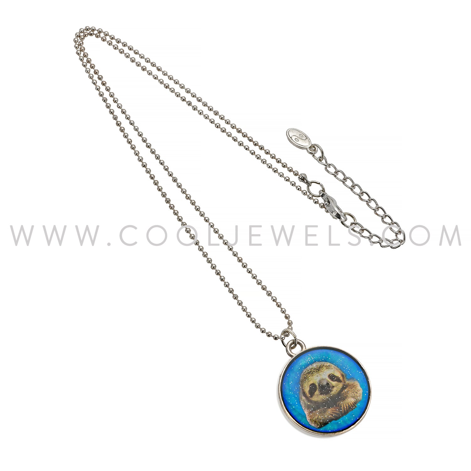 SILVER BALL CHAIN NECKLACE WITH ROUND GLITTER MOOD SLOTH PENDANT - CARDED