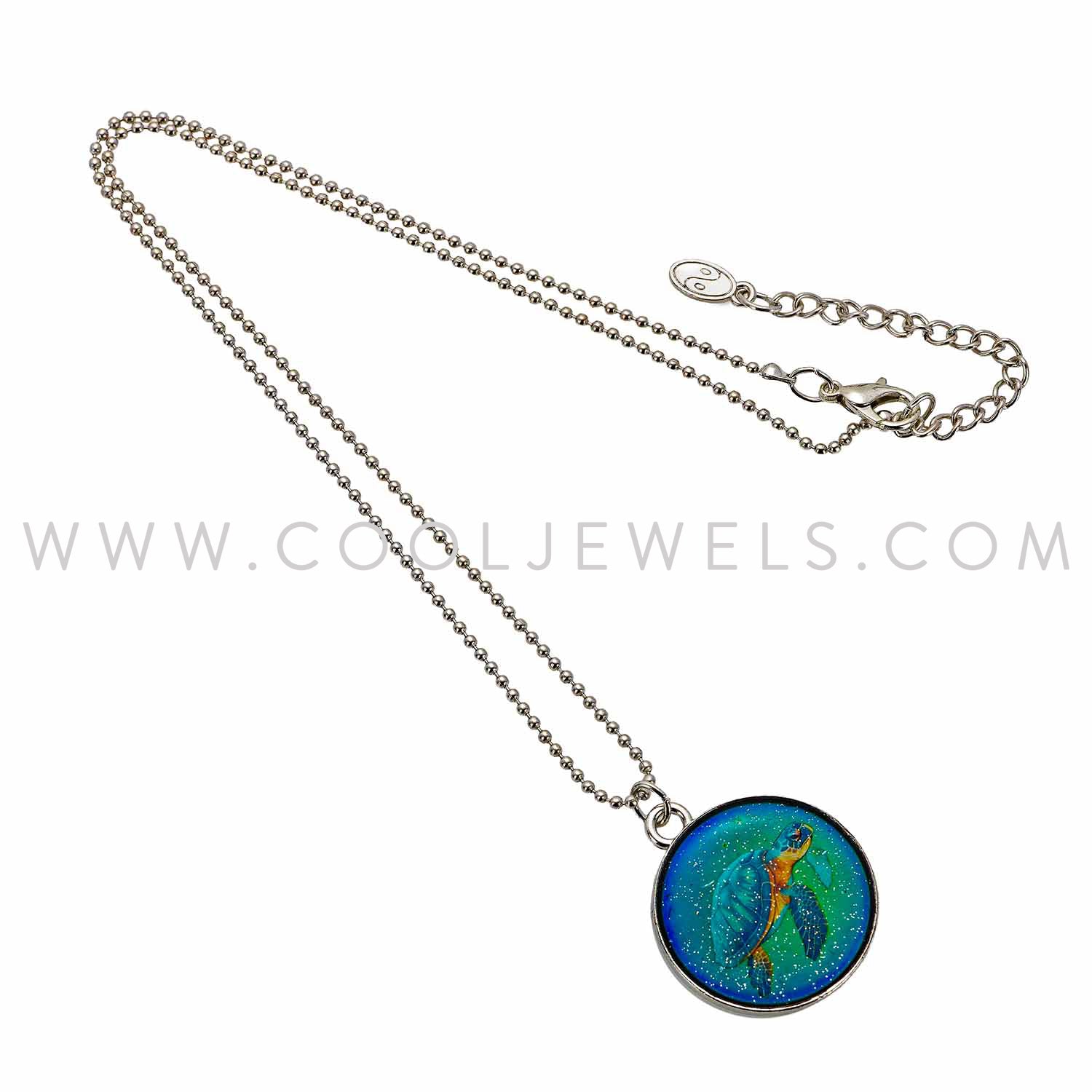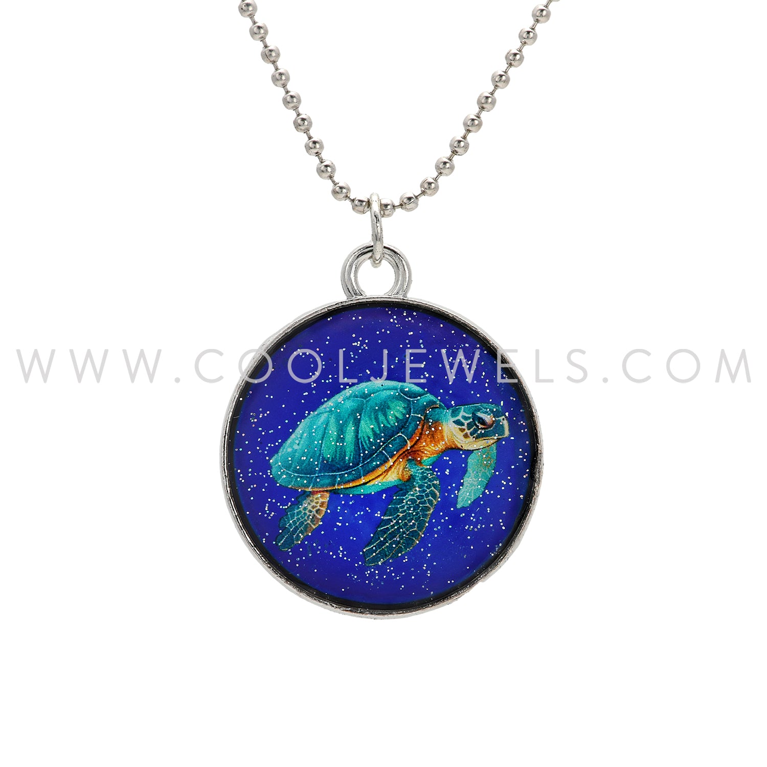 SILVER BALL CHAIN NECKLACE WITH ROUND GLITTER MOOD SEATURTLE PENDANT - CARDED