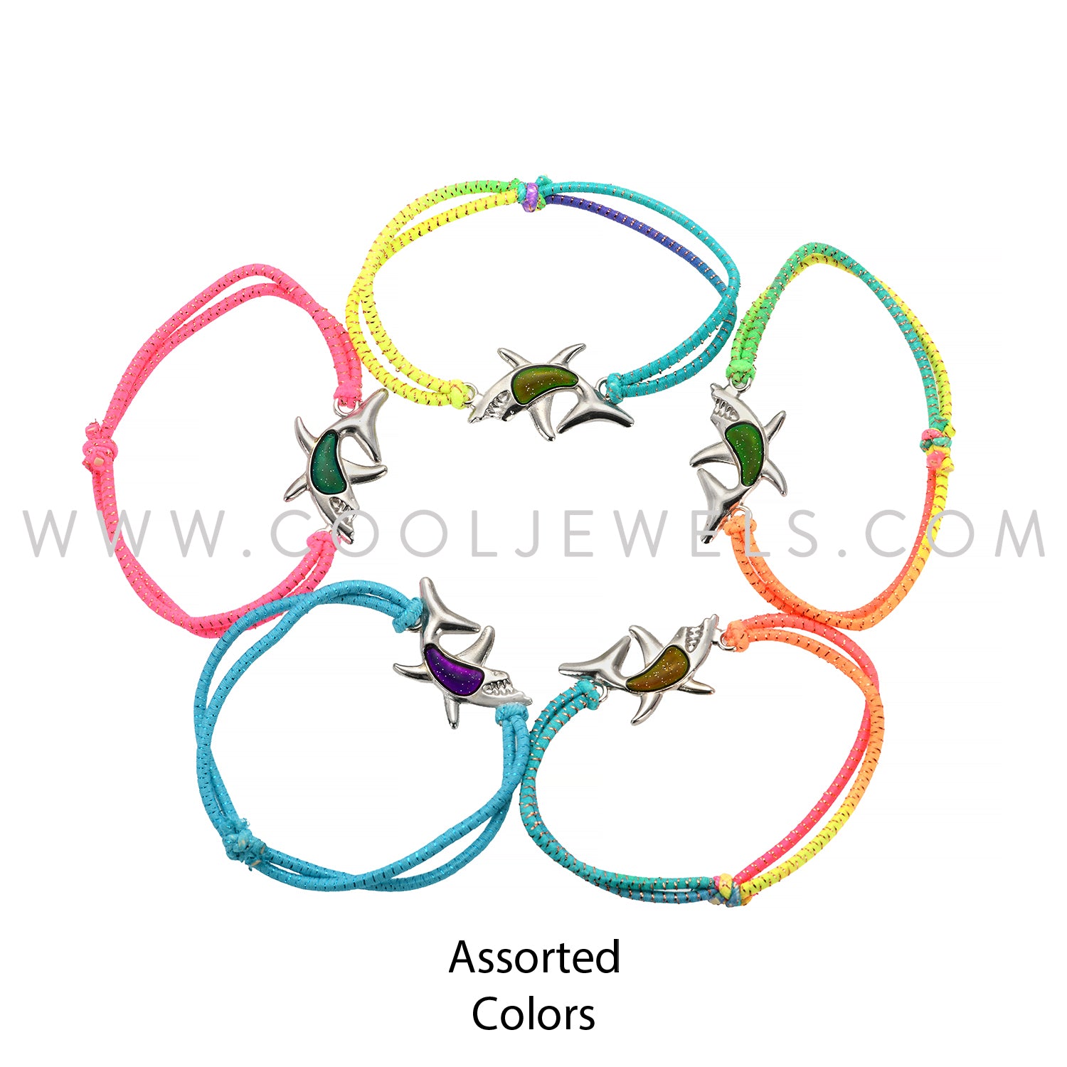 These fun and colorful Assorted Mood Shark Bracelets feature a cool shark pendant on a stretch woven bracelet cord.