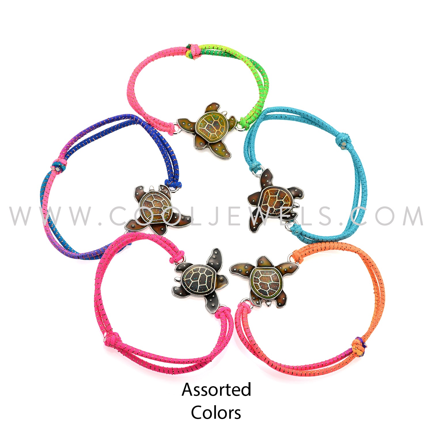 These fun and colorful Assorted Mood Turtle Bracelets feature a cool turtle pendant on a stretch woven bracelet cord.