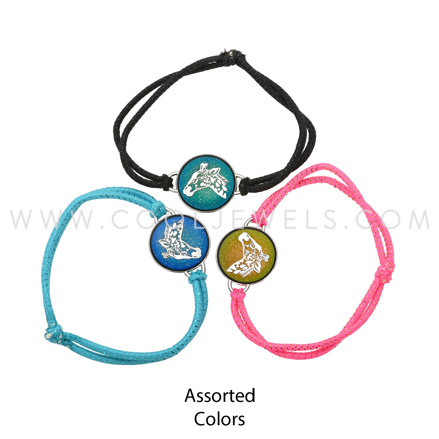 These Assorted Black, Blue, & Pink Color Mood Giraffe Bracelets / Anklets feature a round color changing mood giraffe pendant on a brightly colored Bracelets / Anklets. Each dozen comes with an assortment of 3 colored Bracelets / Anklets.