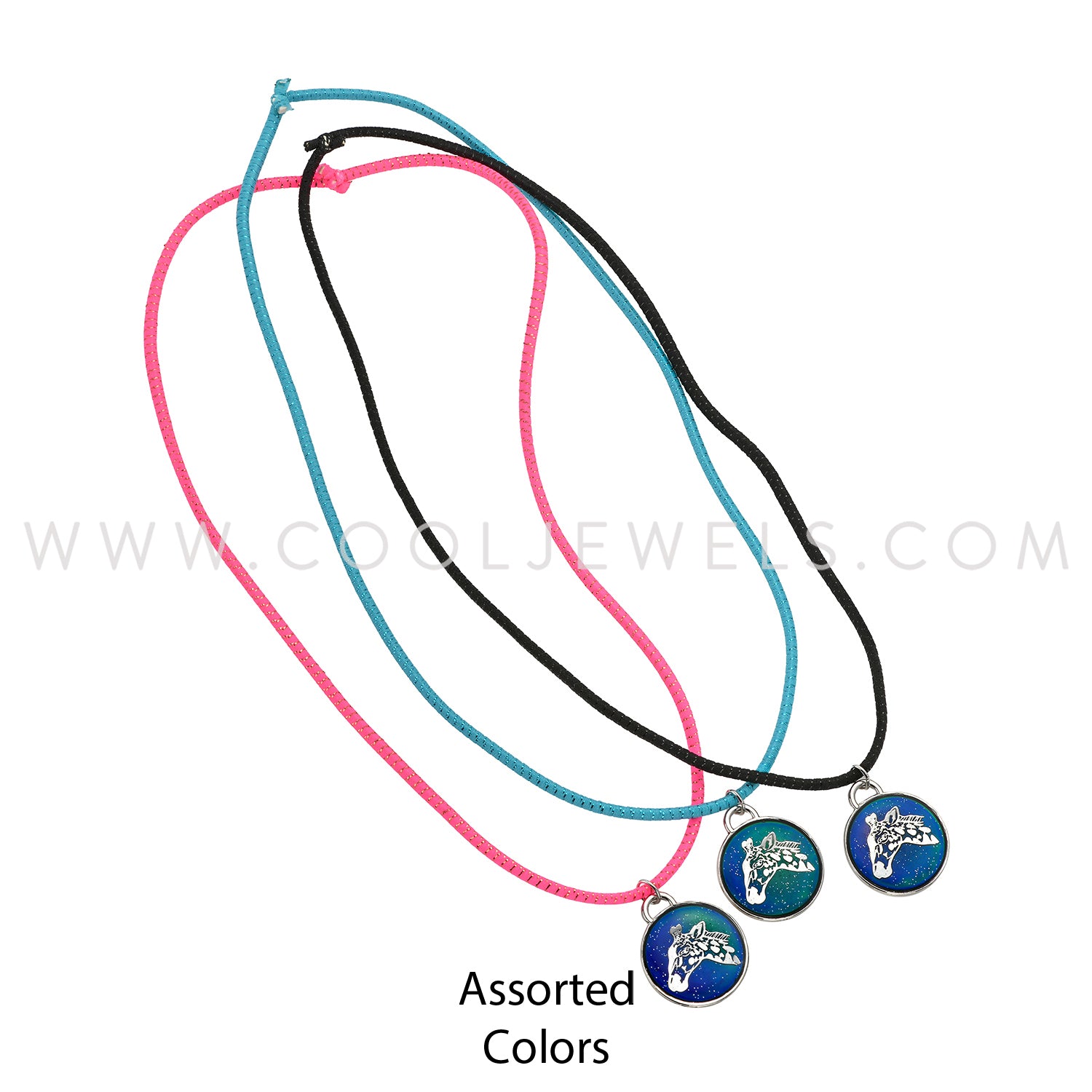 These Assorted Black, Blue, & Pink Color Mood Giraffe Necklaces feature a round color changing mood giraffe pendant on a brightly colored necklace. Each dozen comes with an assortment of 3 colored necklaces.