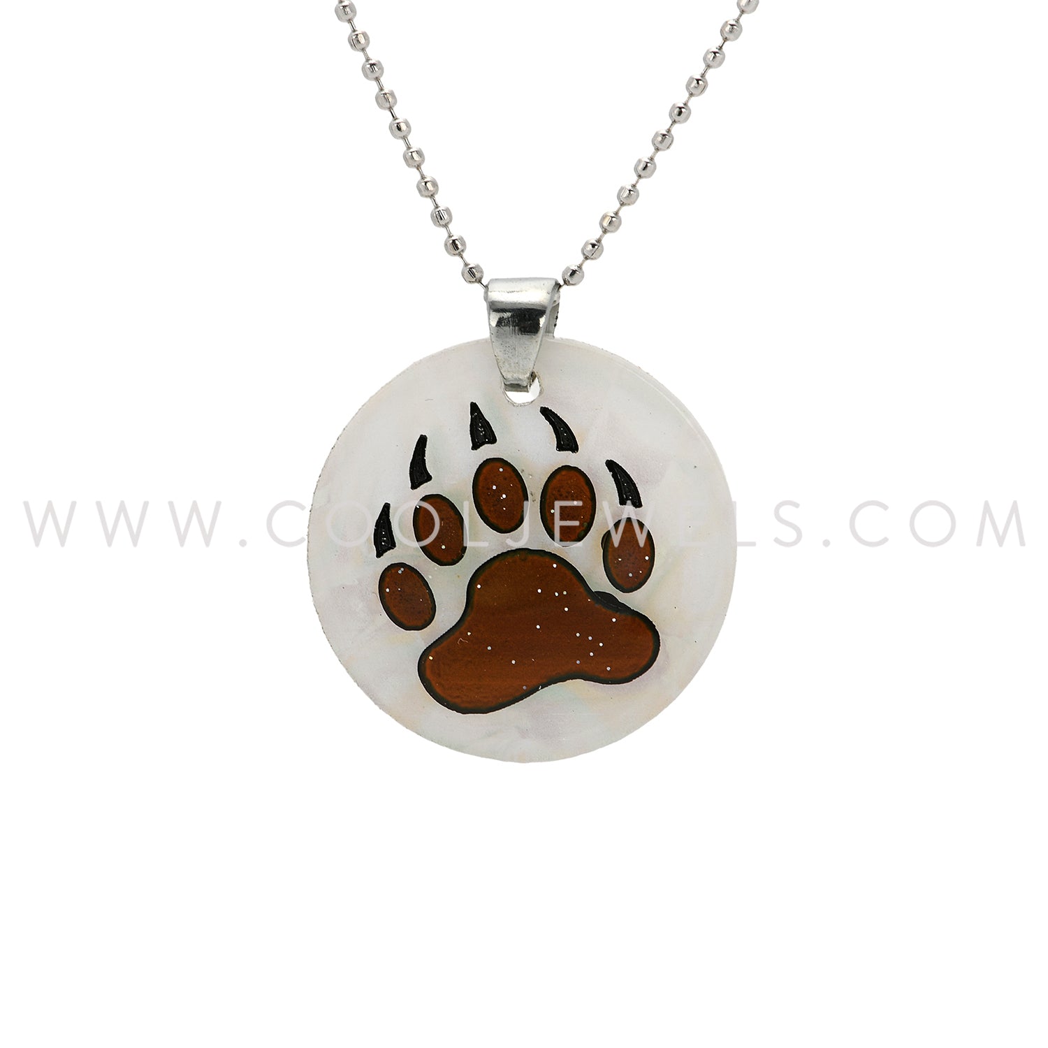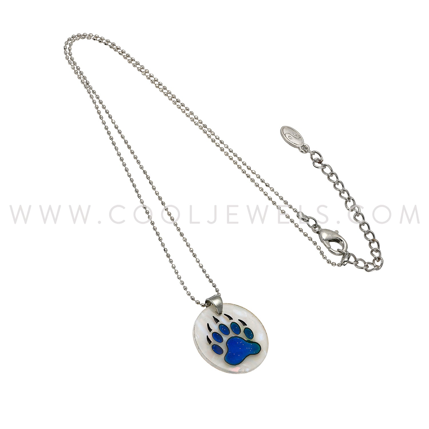 This Glitter Mood Bear Paw Necklace features a circular disk pendant with a color changing mood bear paw on a silver diamond cut ball chain necklace.