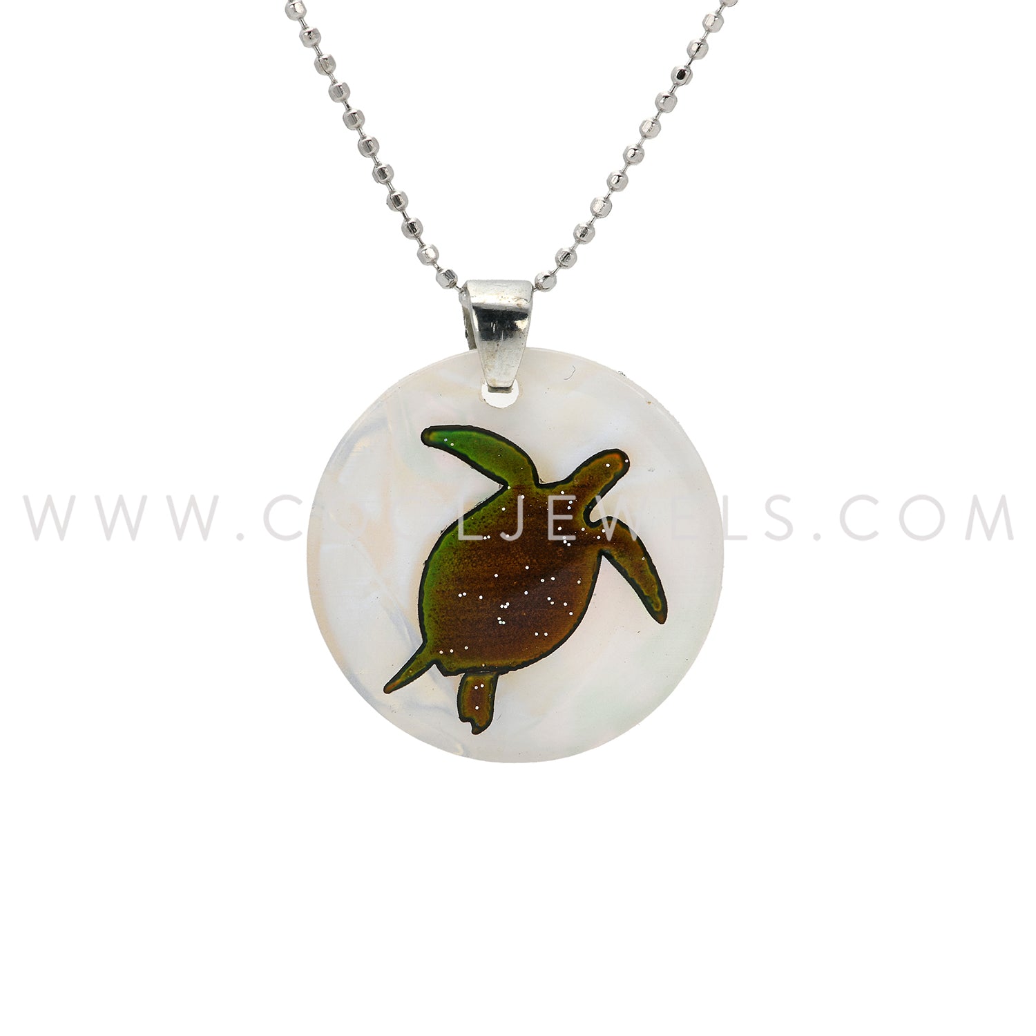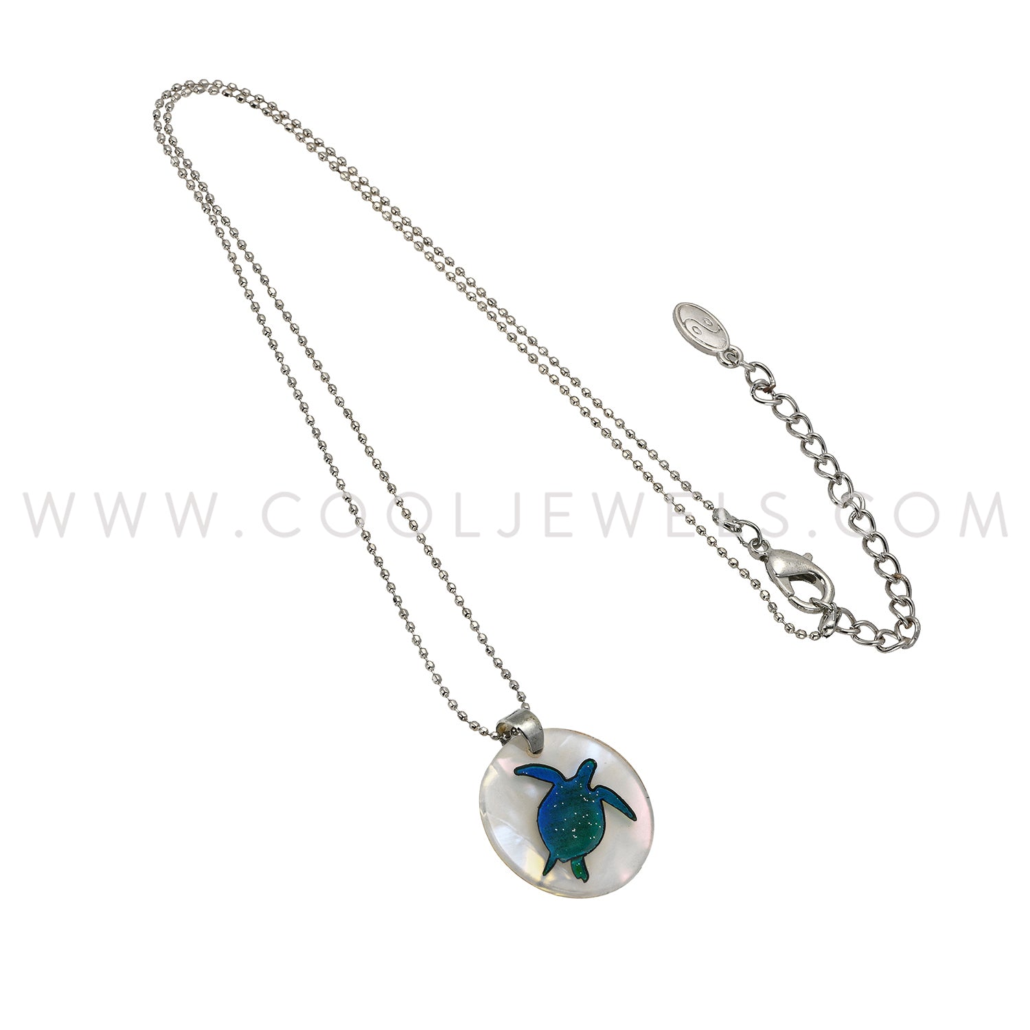This Glitter Mood Turtle Necklace features a circular disk pendant with a color changing mood turtle on a silver diamond cut ball chain necklace.