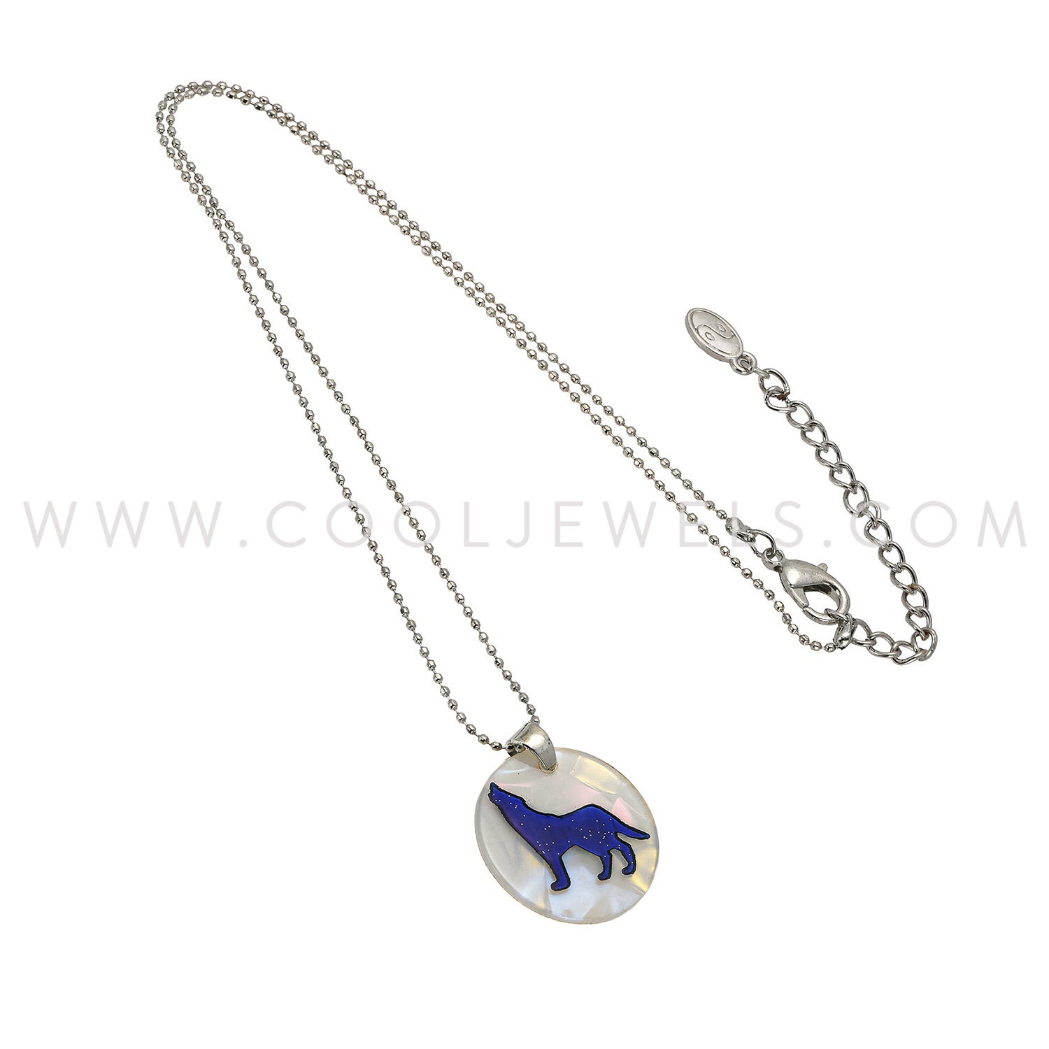 This Glitter Mood Wolf Necklace features a circular disk pendant with a color changing mood wolf on a silver diamond cut ball chain necklace.