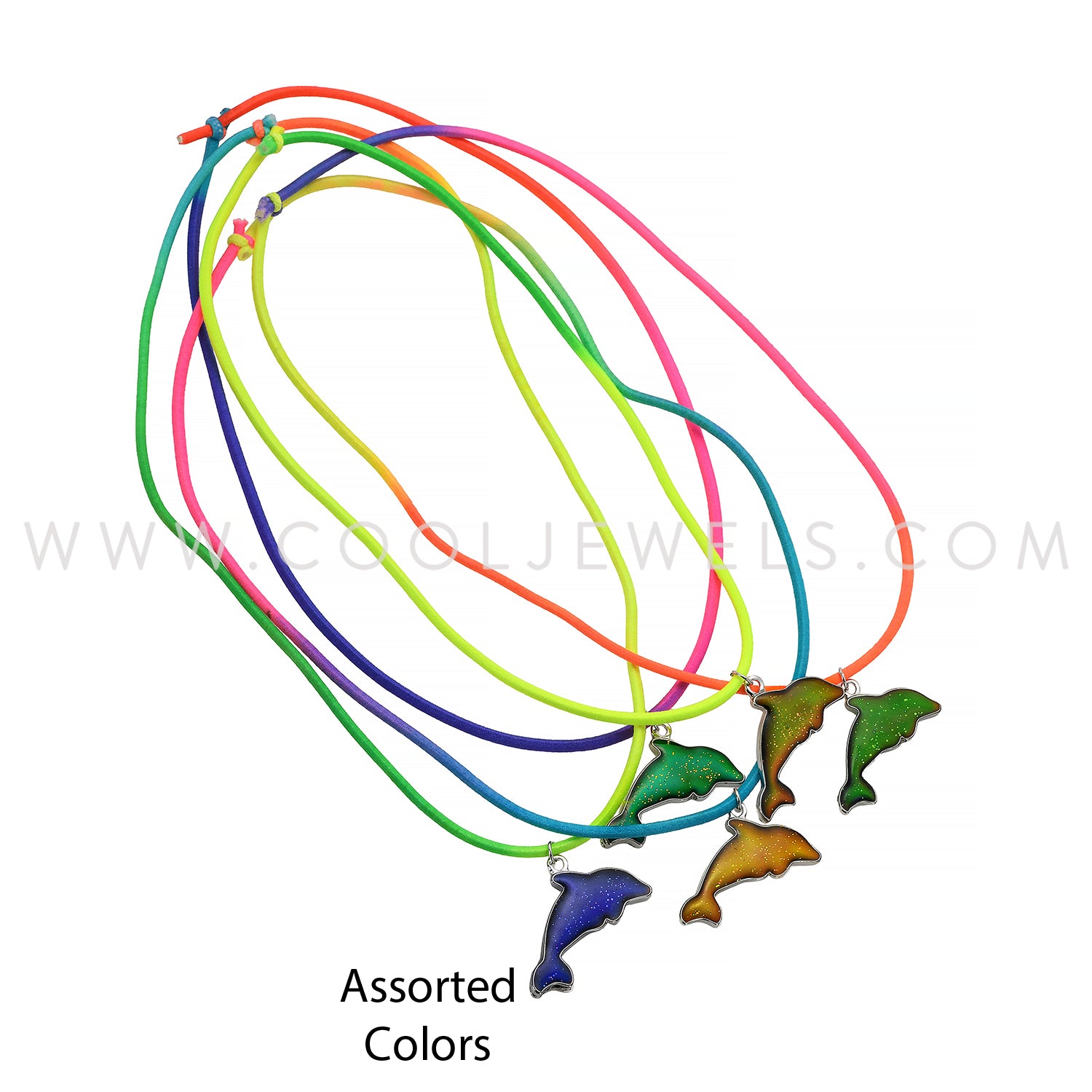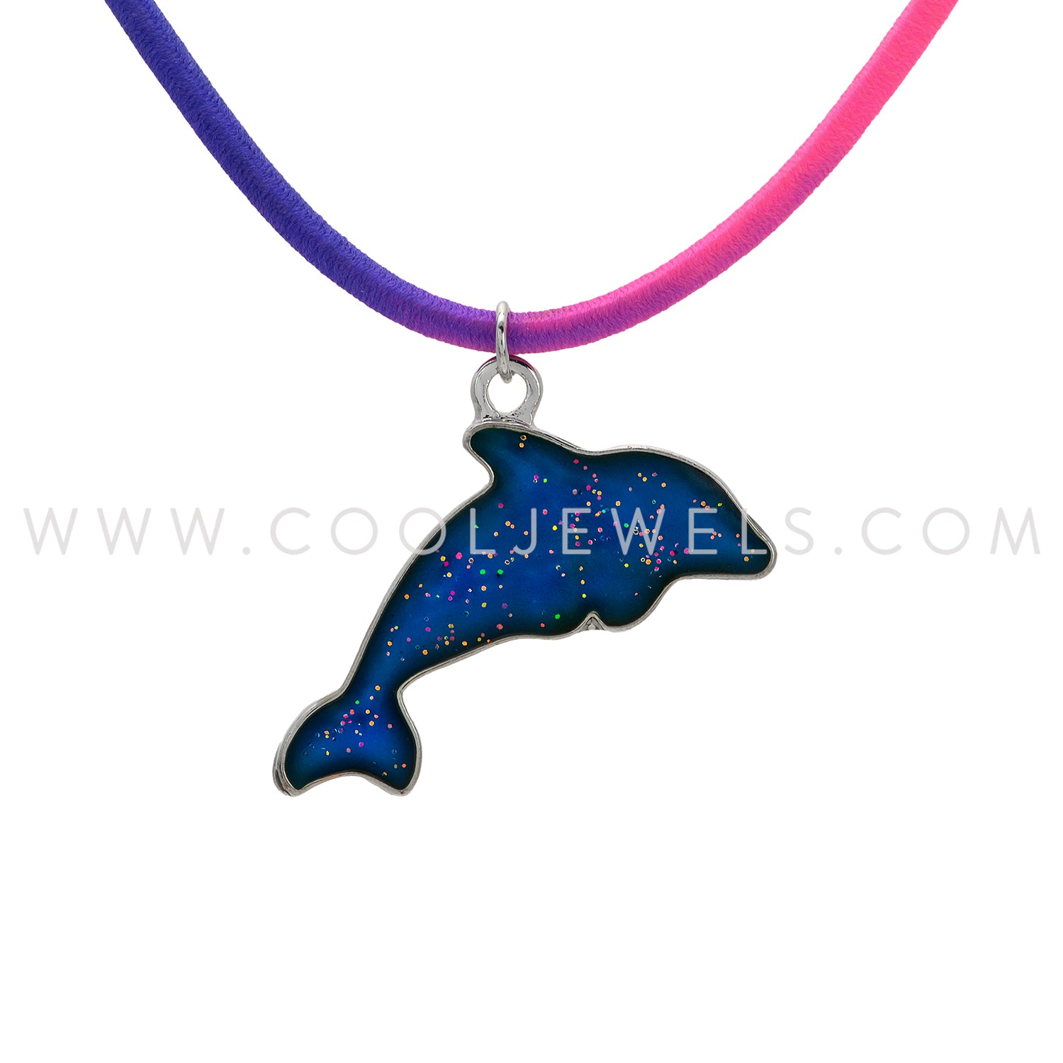 These Glitter Mood Dolphin Rainbow Necklaces feature a glitter mood dolphin pendant suspended on a rainbow stretch necklace.