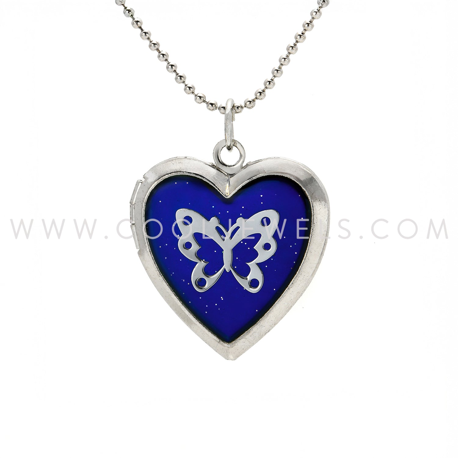 These wonderful Glitter Mood & Butterfly Heart-Shaped Locket Necklaces feature a glitter color changing mood butterfly heart-shaped locket suspended on a silver ball chain necklace.