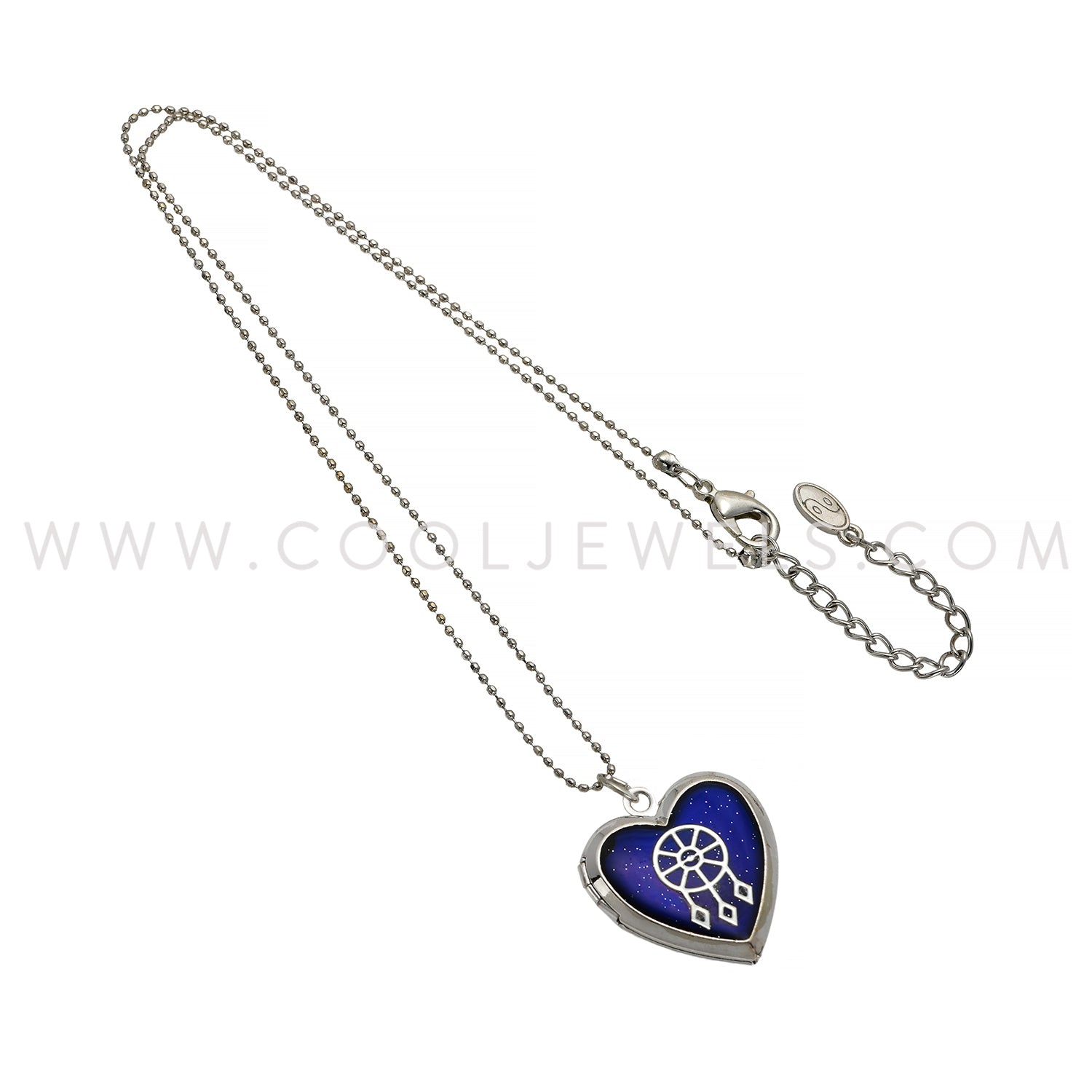 These wonderful Glitter Mood & Dream Catcher with "Sweet Dreams" Heart-Shaped Locket Necklaces feature a glitter color changing mood dream cathcer heart-shaped locket with Sweet Dreams inscribed on the back suspended on a silver ball chain necklace.