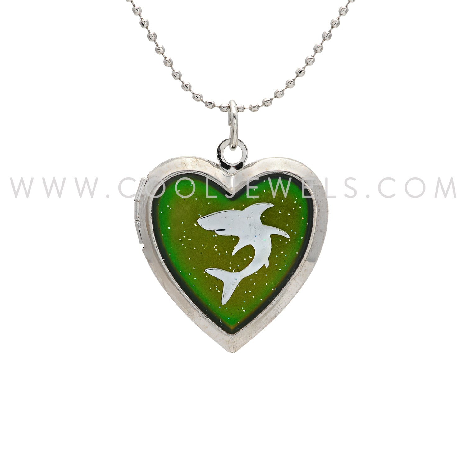 These wonderful Glitter Mood & Shark Heart-Shaped Locket Necklaces feature a glitter color changing mood shark heart-shaped locket suspended on a silver ball chain necklace.