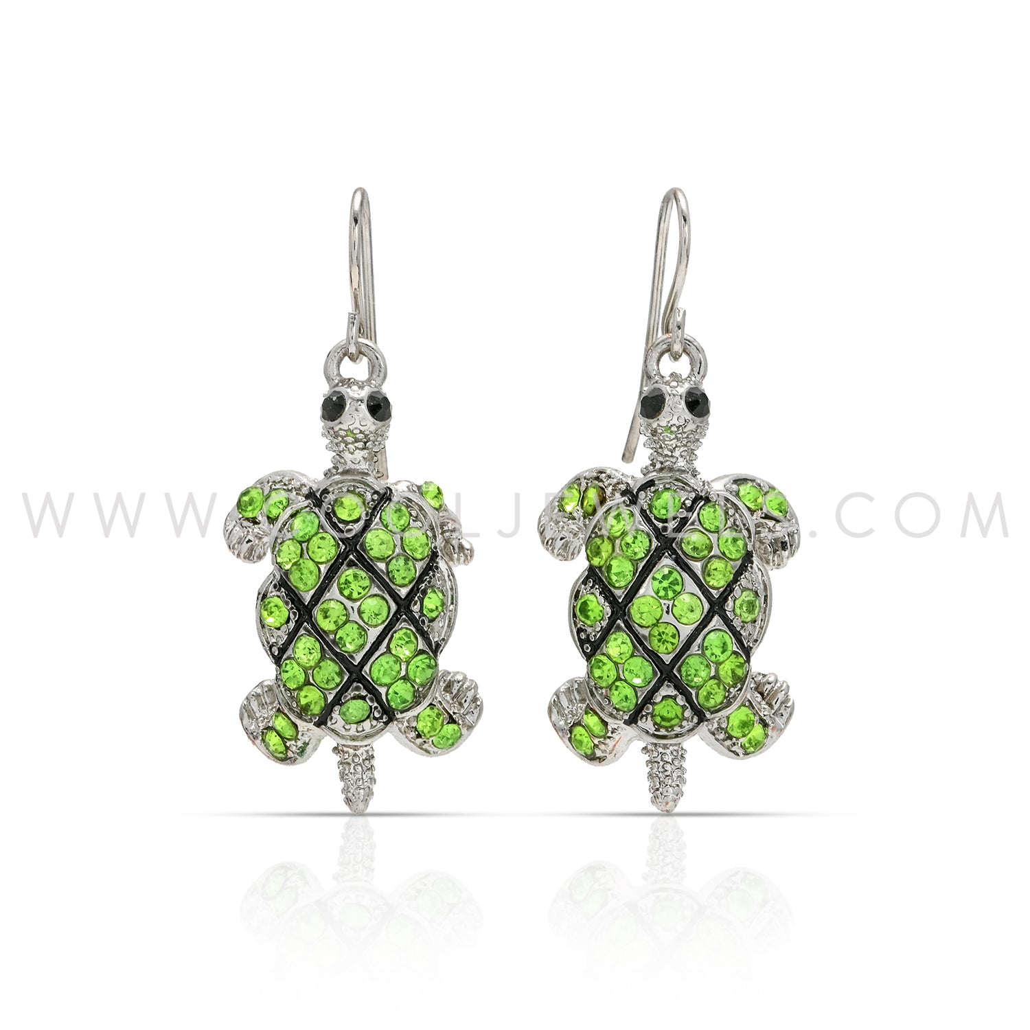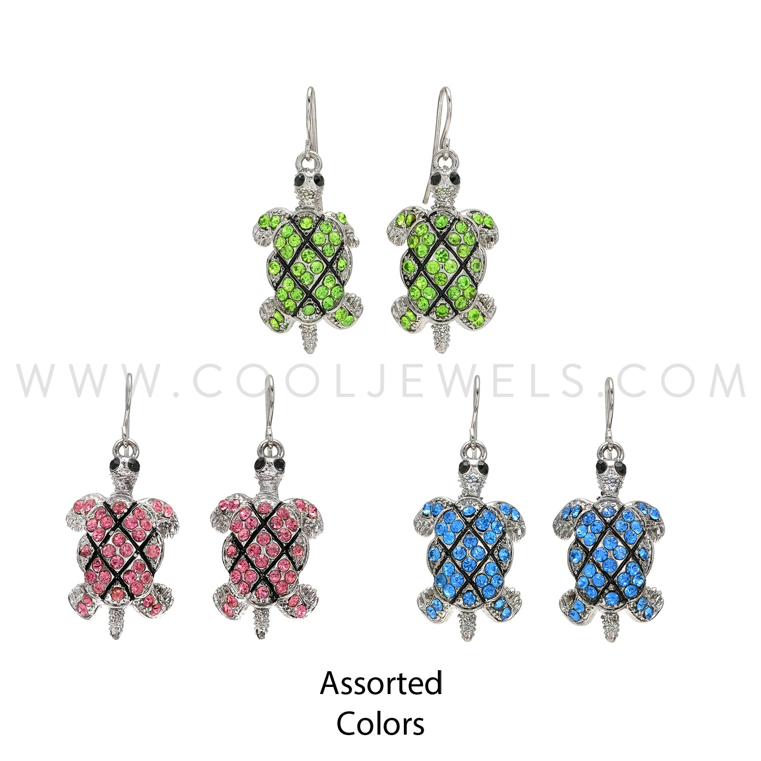 These Assorted Color Rhinestone Turtle Earrings feature a silver turtle accented with a variety of colored rhinestones.