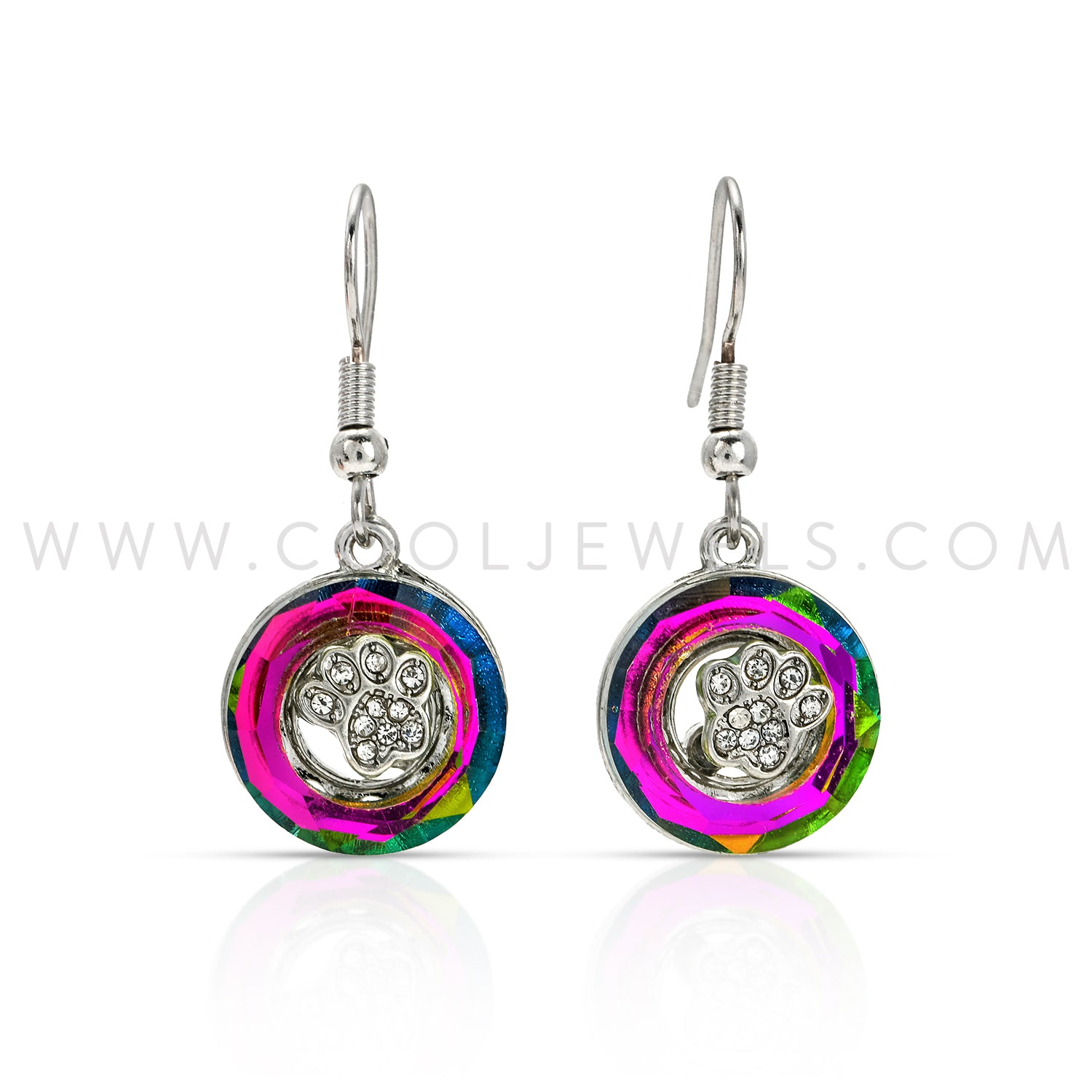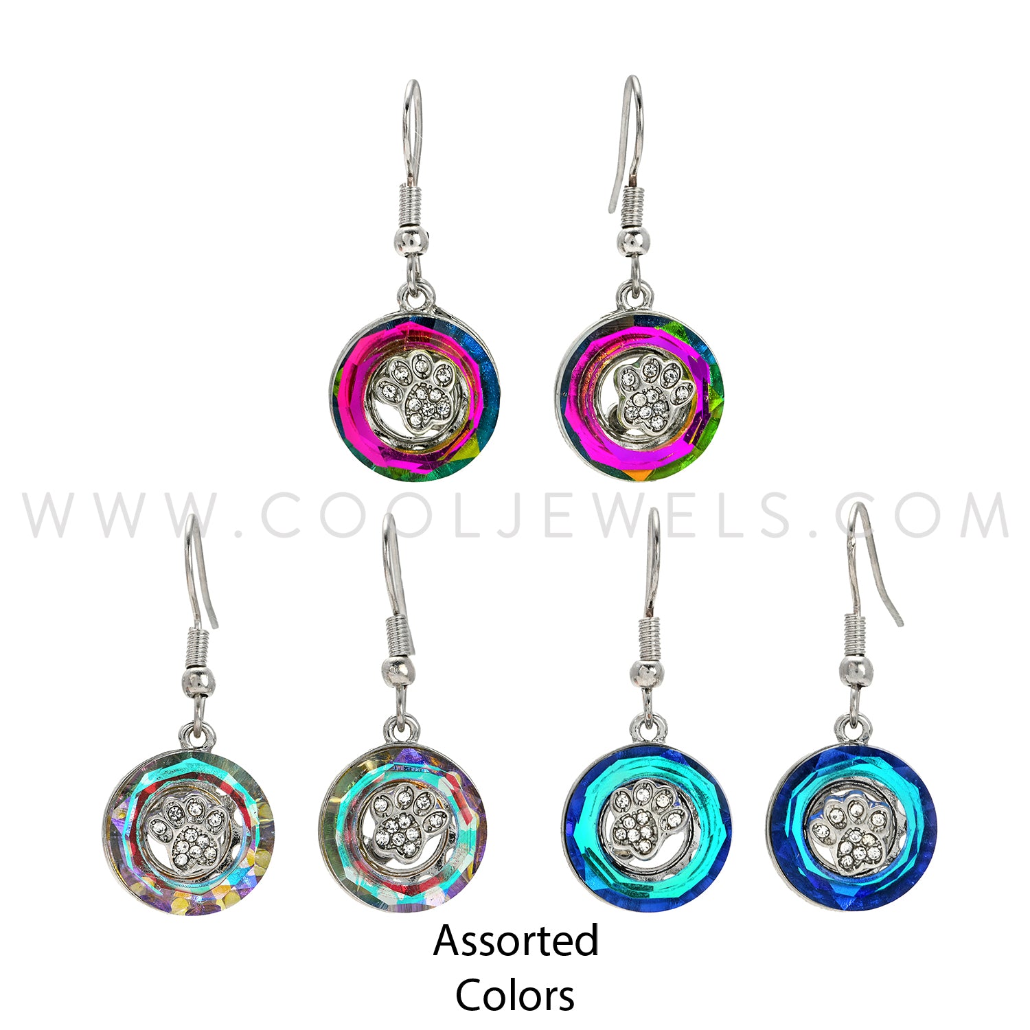 FISH HOOK EARRINGS WITH ROUND CRYSTAL PENDANT WITH RHINESTONE PAW