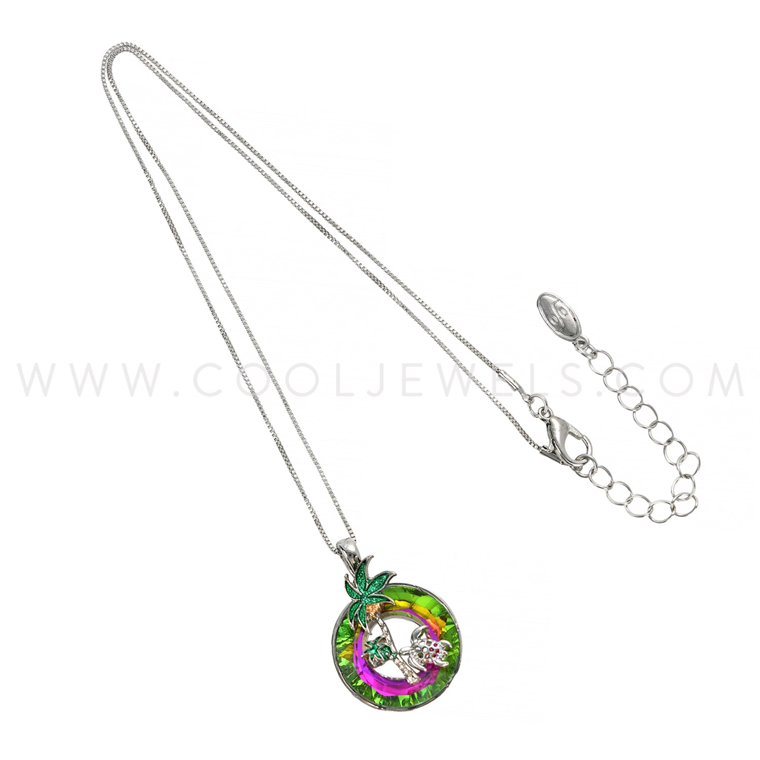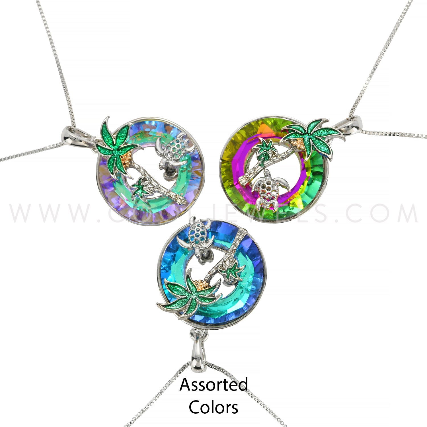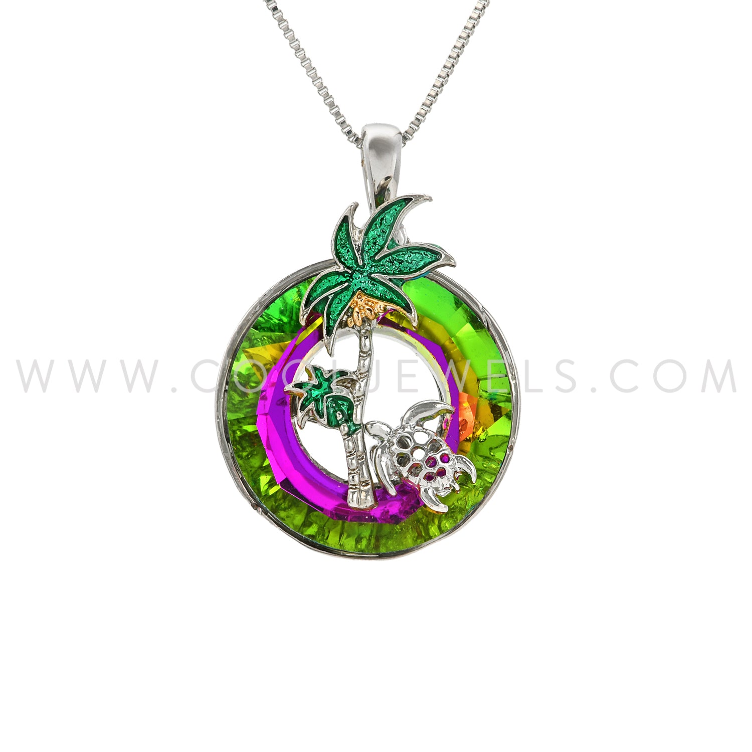 LINK CHAIN NECKLACE WITH ROUND CRYSTAL PENDANT WITH TURTLE & PALM TREE