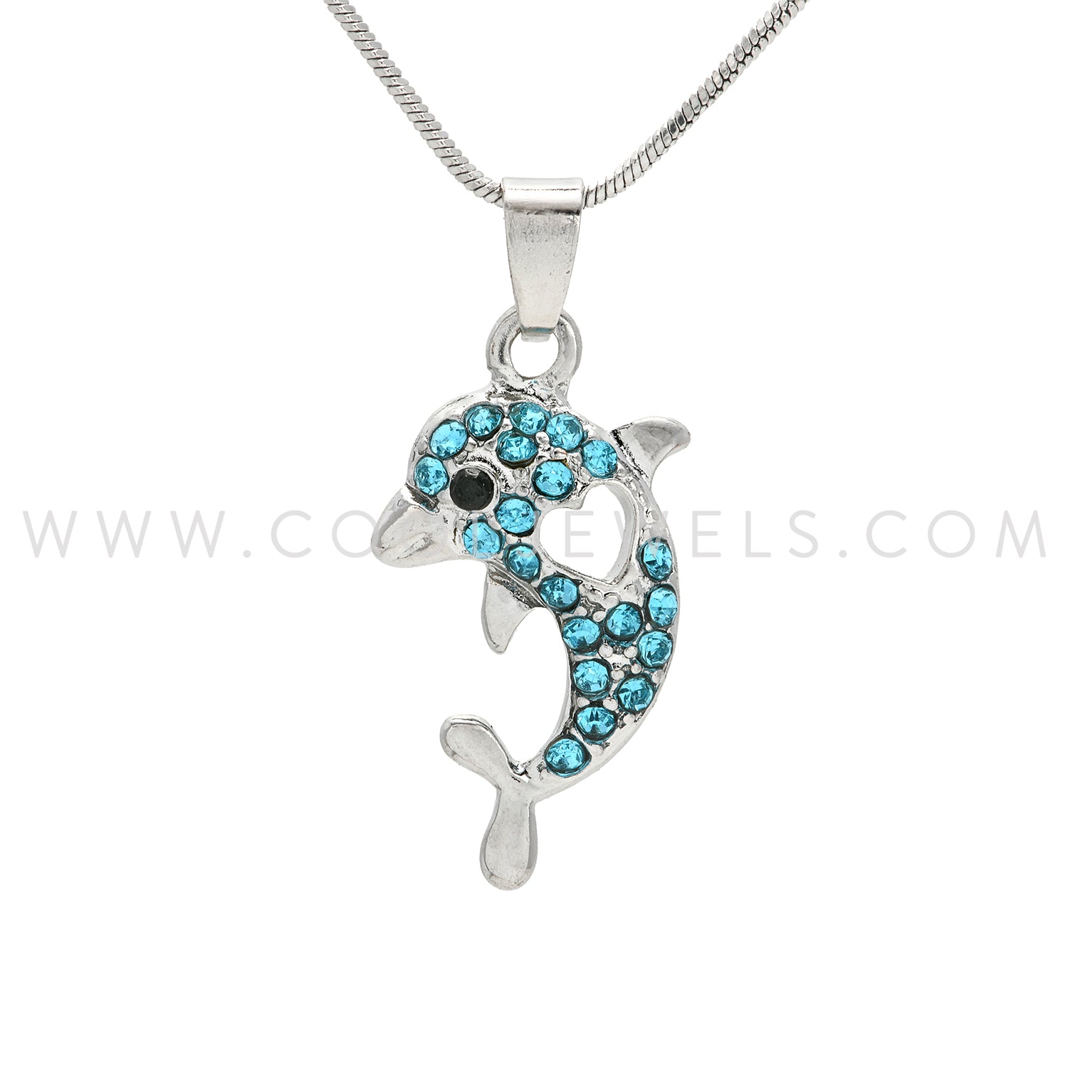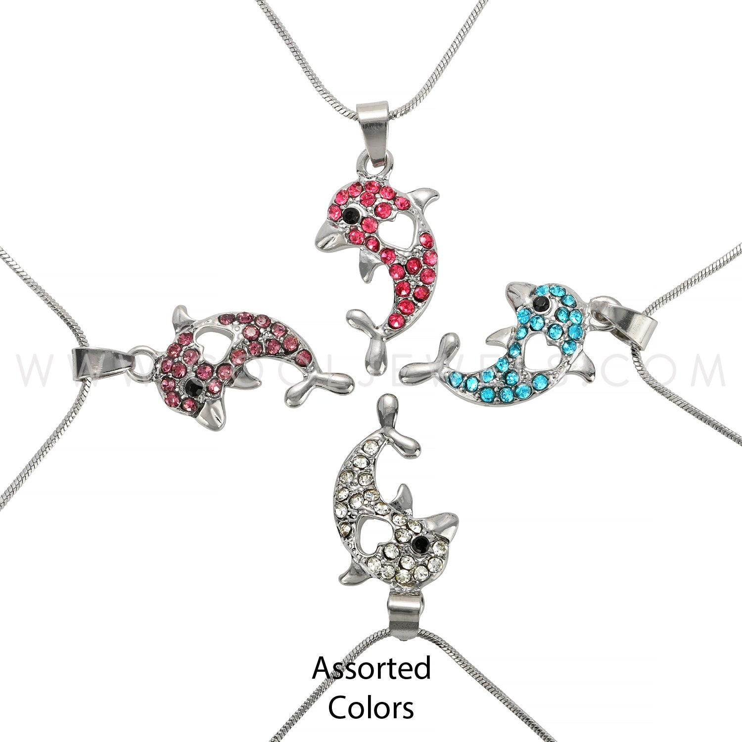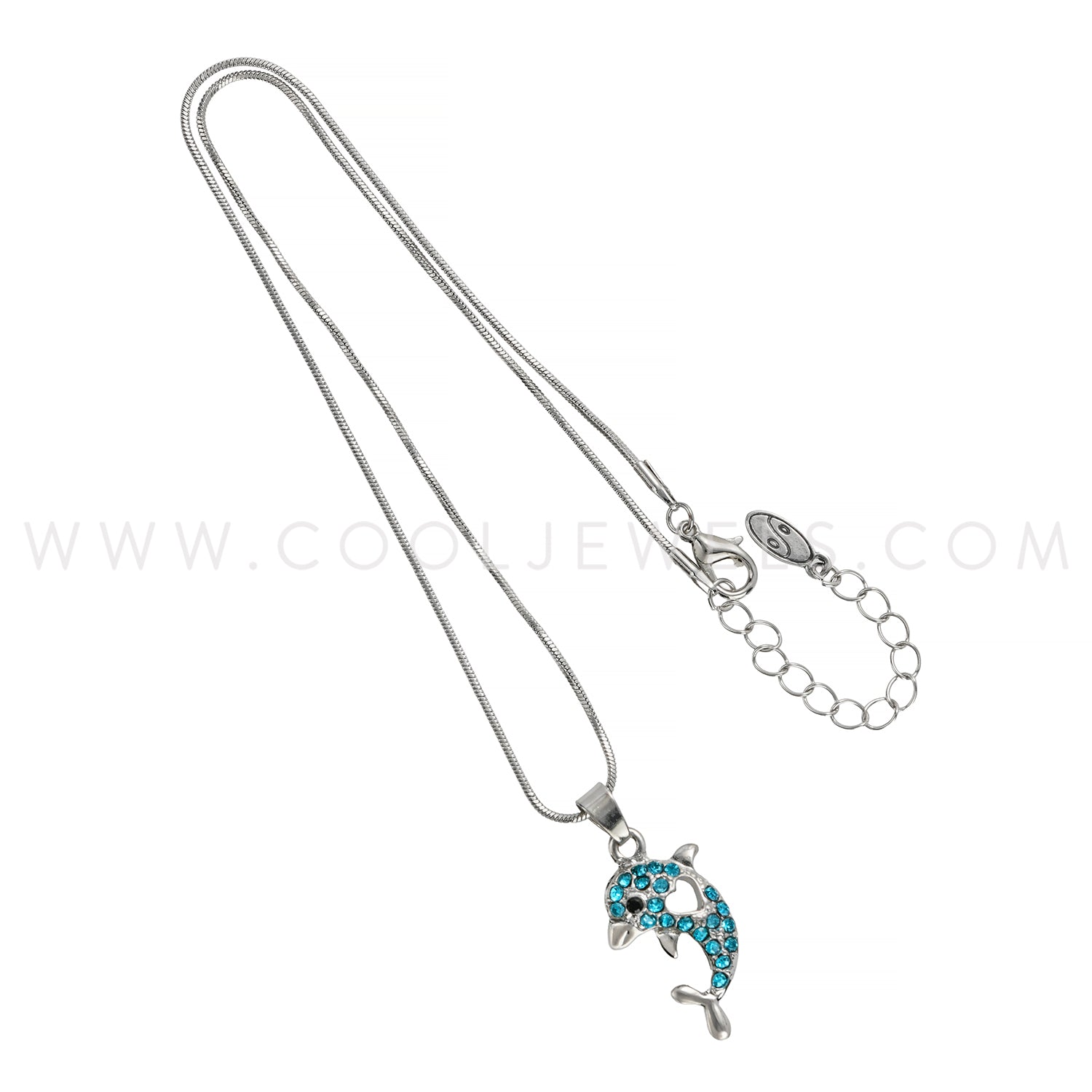 SILVER SNAKE CHAIN NECKLACE WIHT RHINESTONE DOLPHIN & HEART - ASSORTED