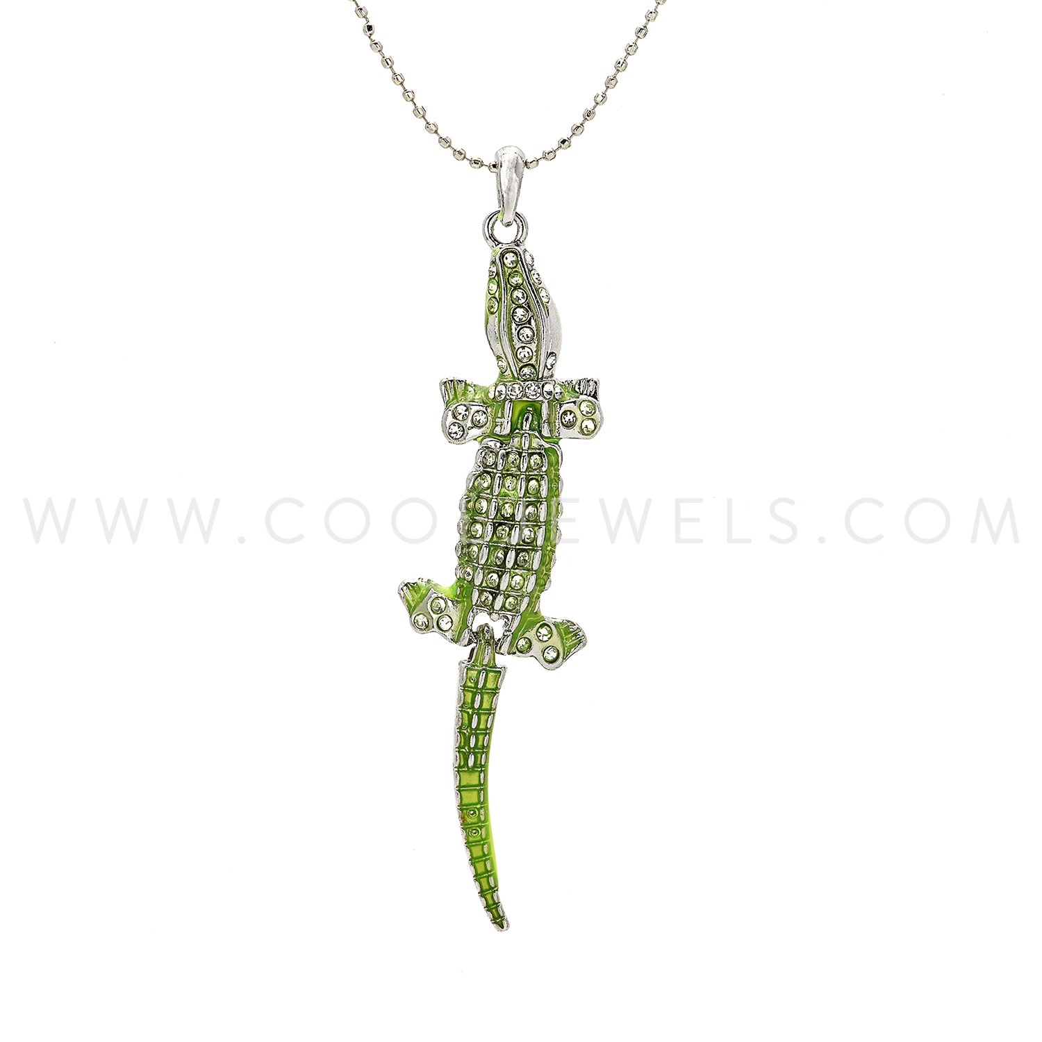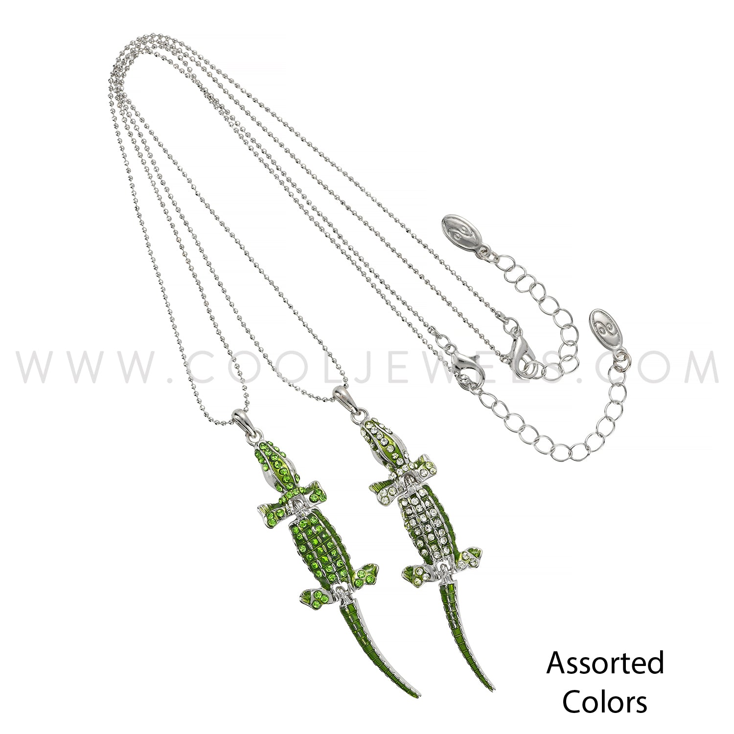 These Assorted Colored Rhinestone Alligator Necklaces feature a silver ball chain with a variety of vibrantly colored rhinestone and alligator pendants.