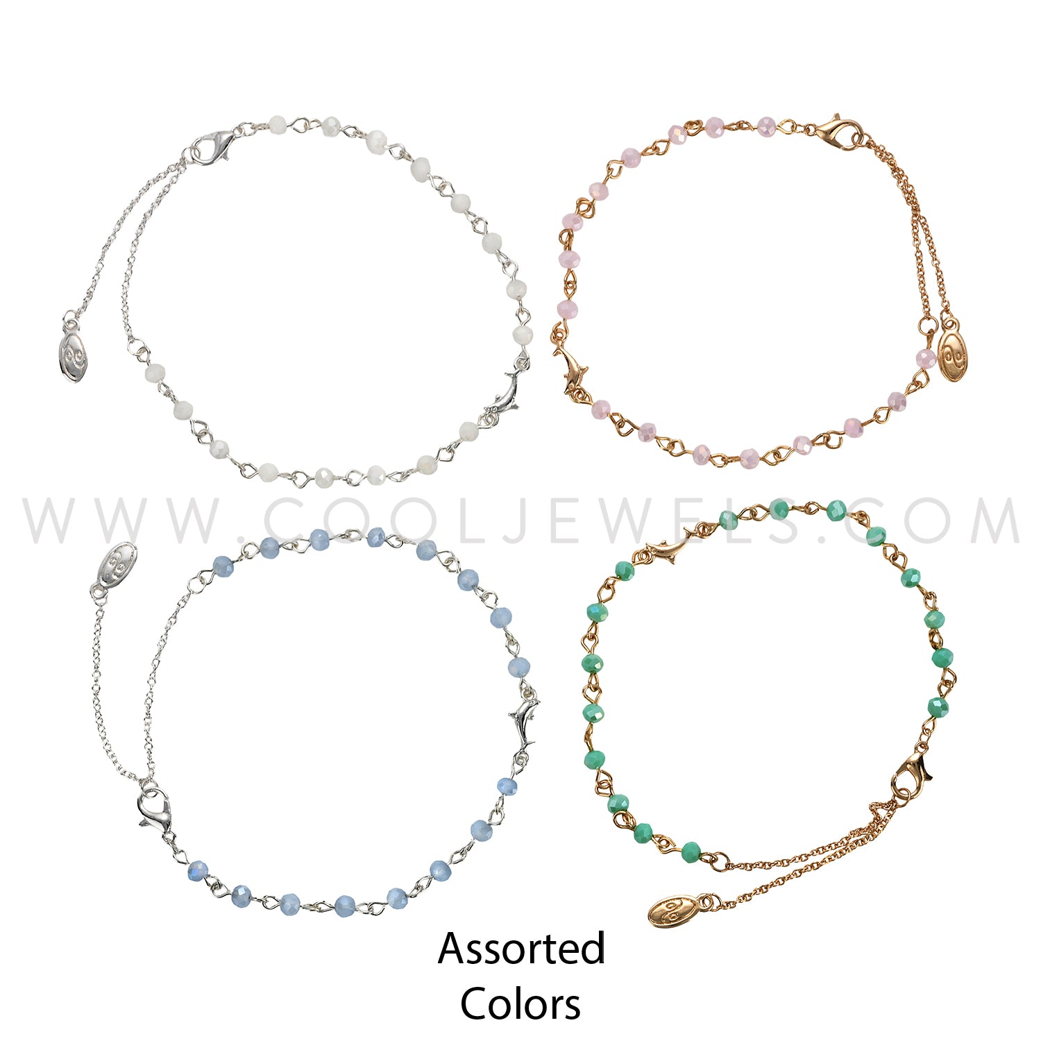 These Assorted Green, Pink, Blue & White Dolphin & Colored Beads Bracelet/Anklet features a dolphin pendant with colored beads on a chain link bracelet/anklet.Bracelets/anklets comes in gold and silver, 6 of each in each dozen.