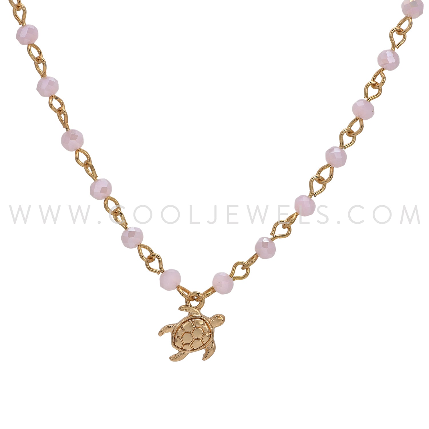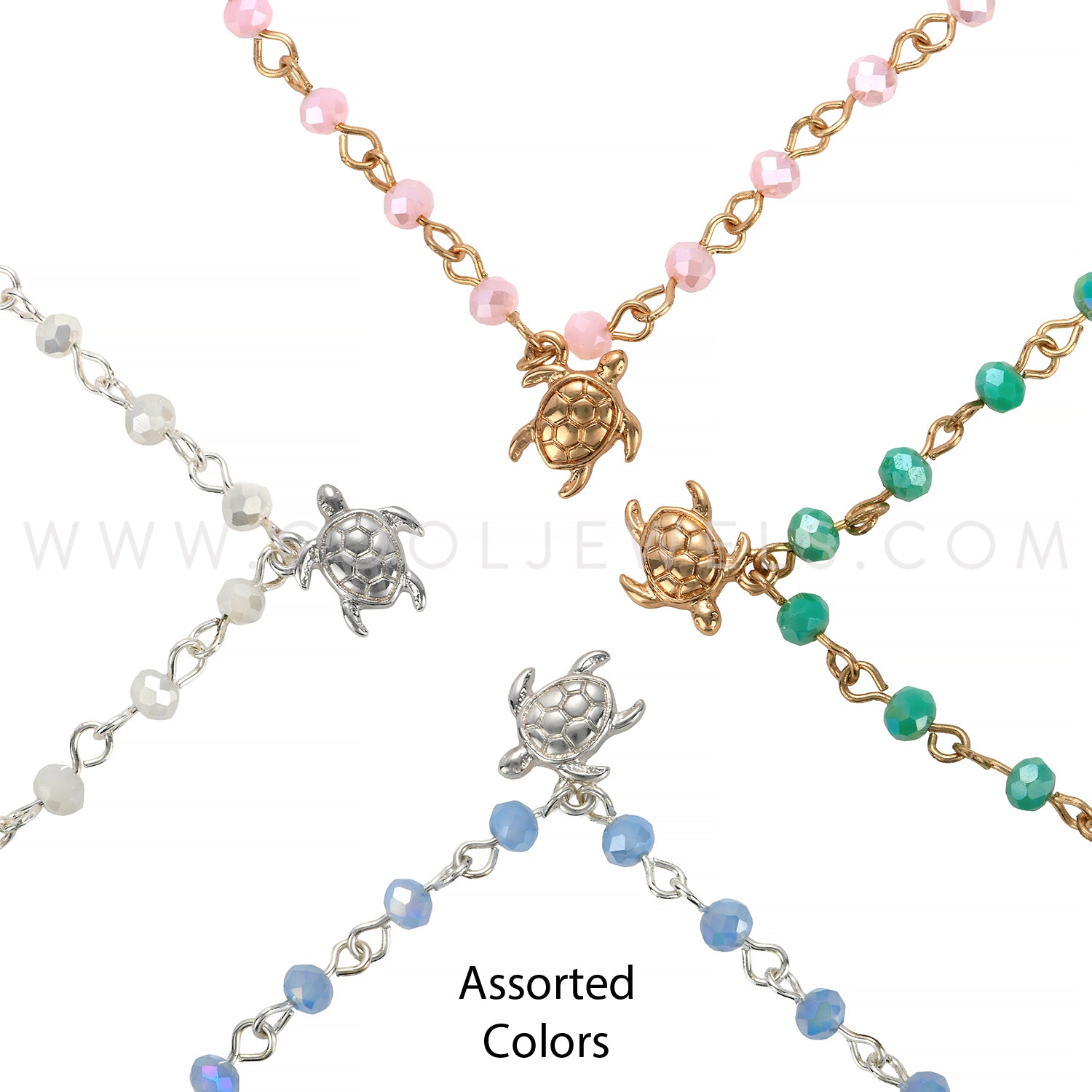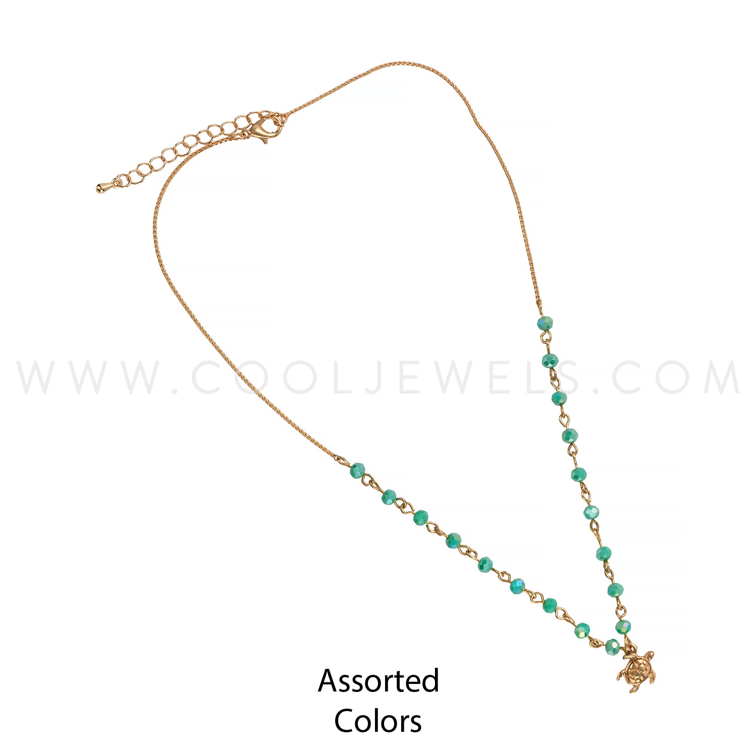 These Assorted Green, Pink, Blue & White Turtle & Colored Beads Necklace features an turtle pendant with colored beads on a chain link necklace.Necklaces come in gold and silver, 6 of each in each dozen.