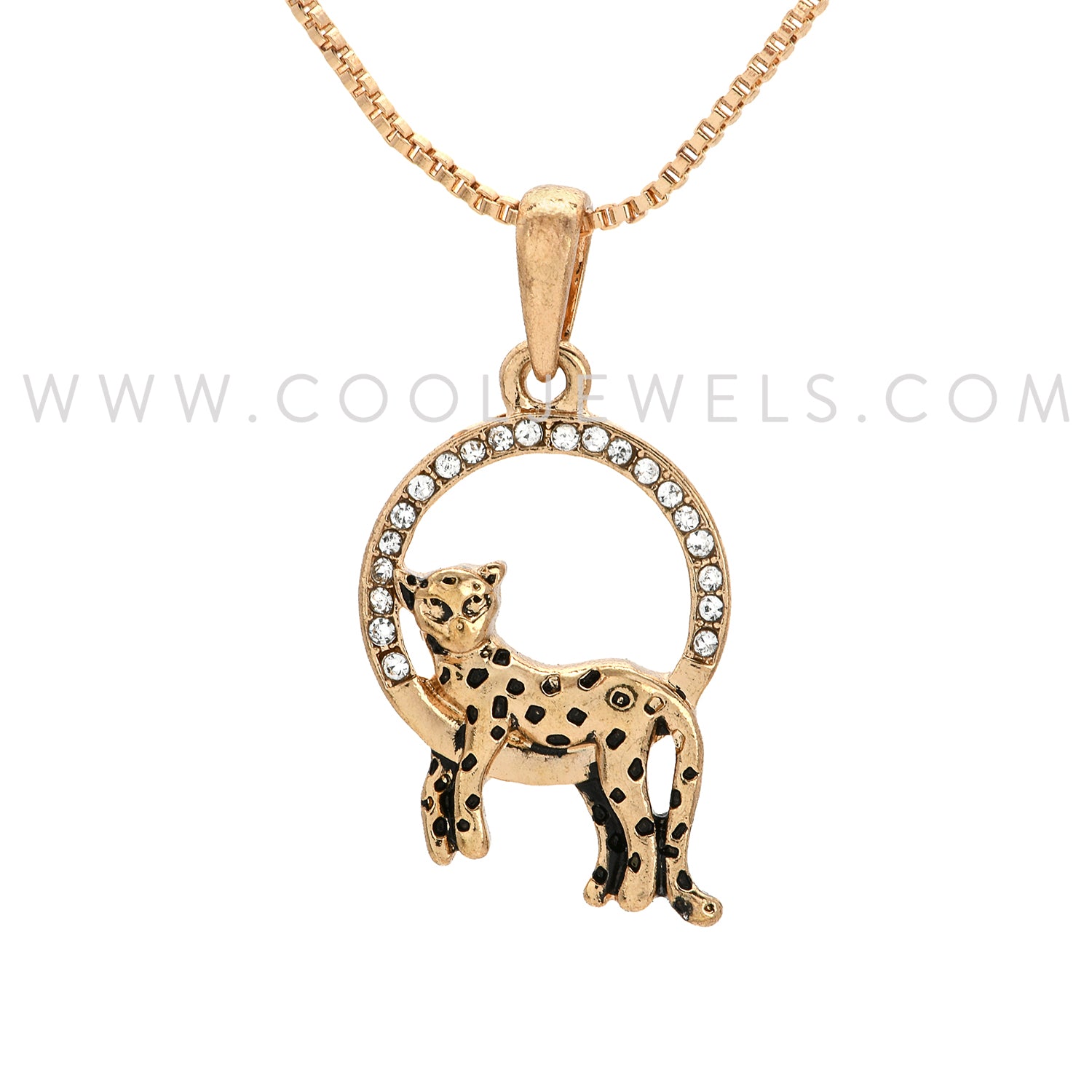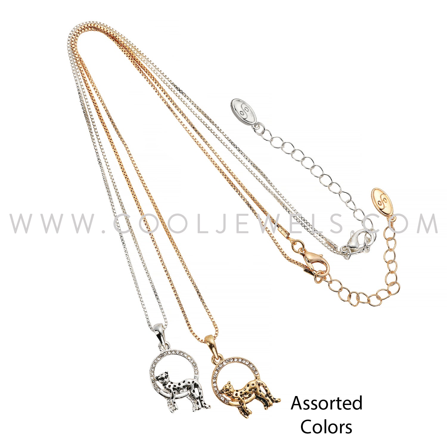 BOX CHAIN NECKLACE WITH ROUND RHINESTONE PENDANT WITH CHEETAH - ASSORTED