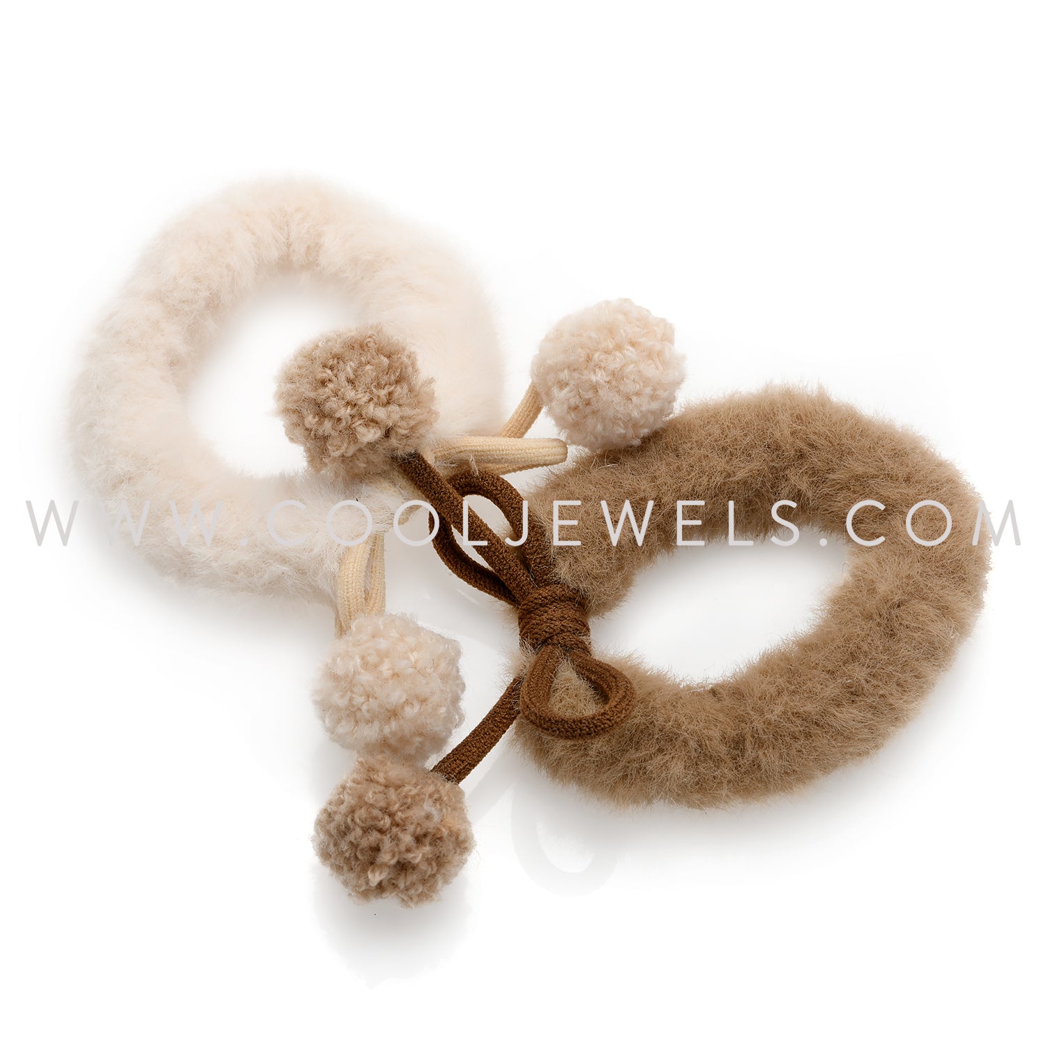 (SET OF 2) FAUX FUR PONY TAIL HOLDERS WITH BOW AND POM POMS - ASSORTED