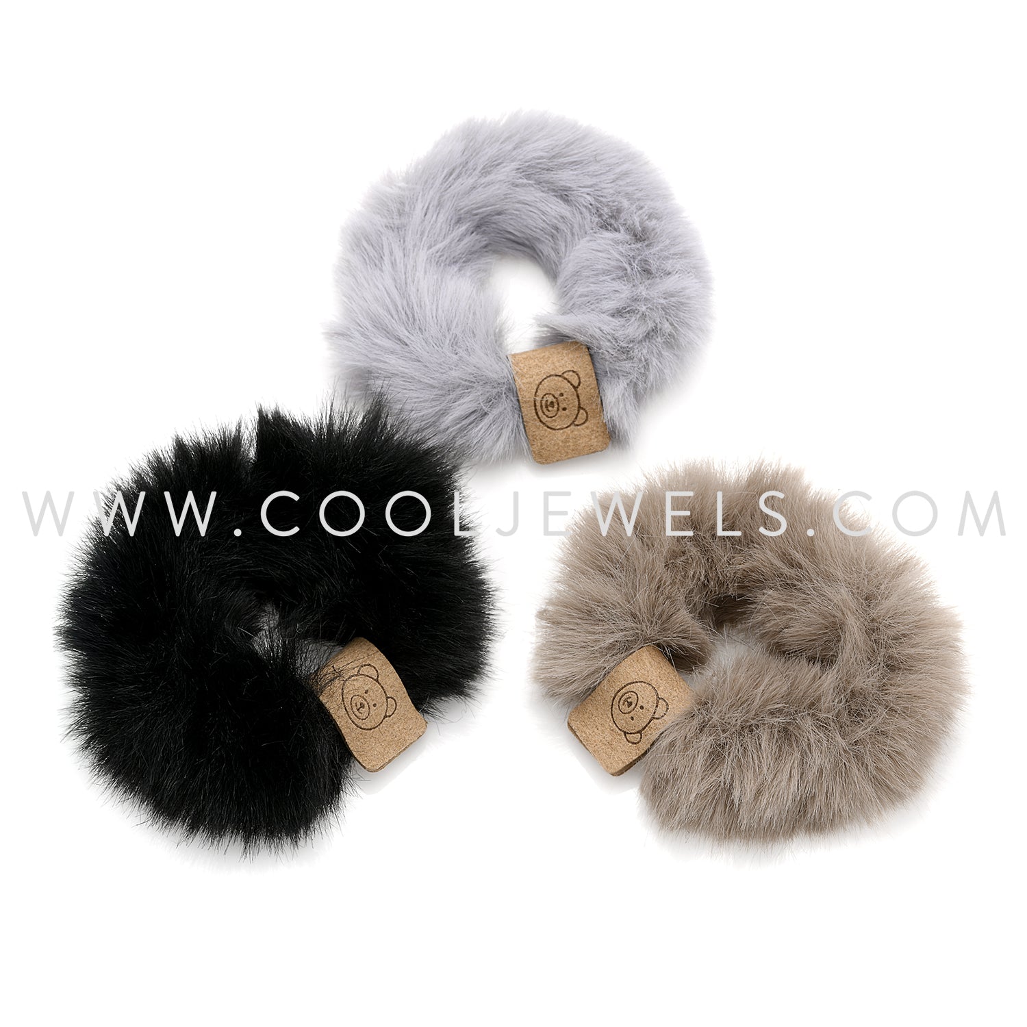 (SET OF 3) FAUX FUR PONY TAIL HOLDERS WITH BEAR - ASSORTED