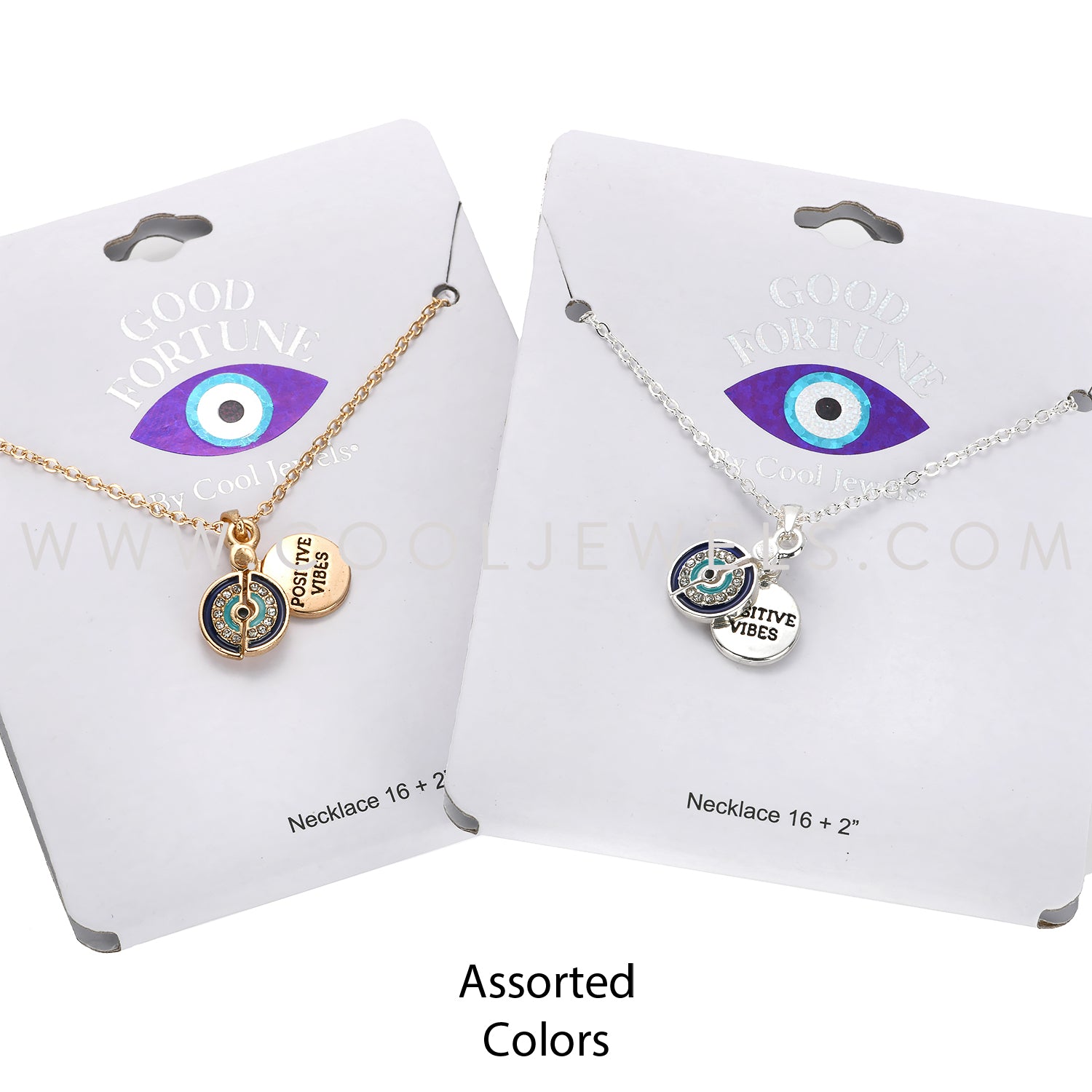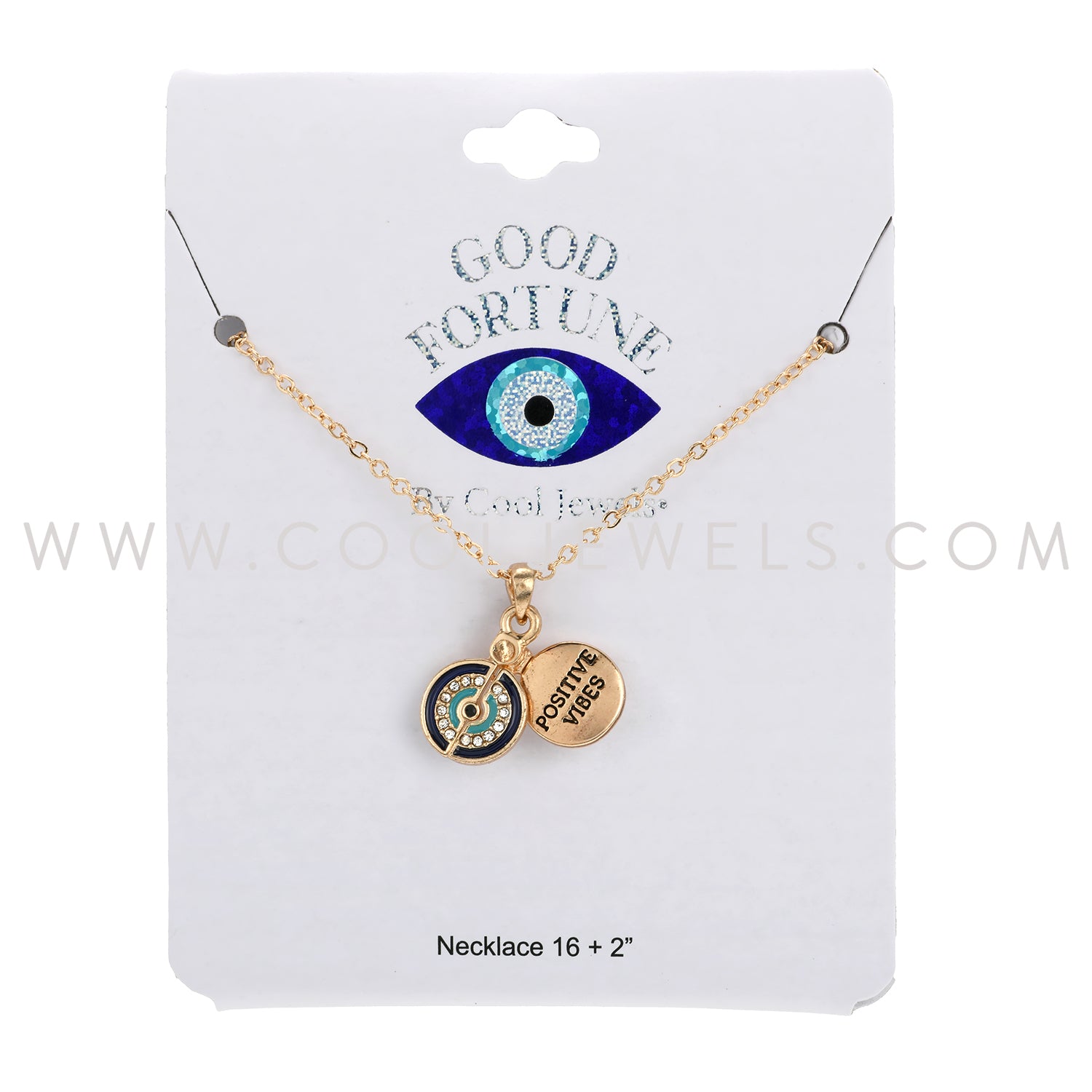 LINK CHAIN NECKLACE WITH EVIL EYE "POSITIVE VIBES" PENDANT ASSORTED - CARDED