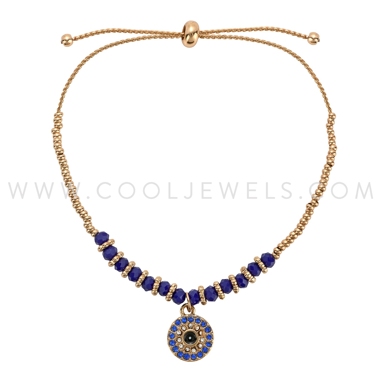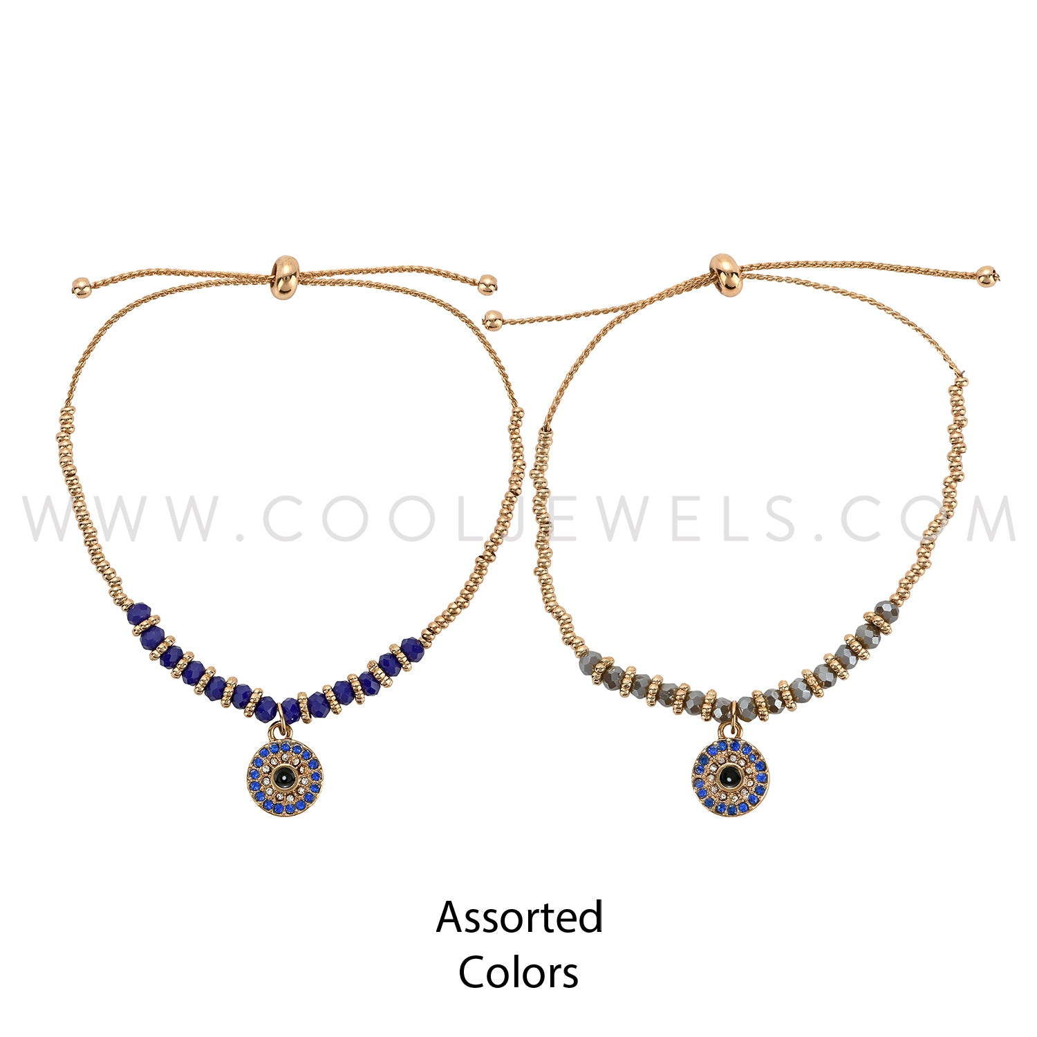 GOLD SLIDER BRACELET WITH RHINESTONE EVIL EYE & CRYSTAL BEADS - ASSORTED