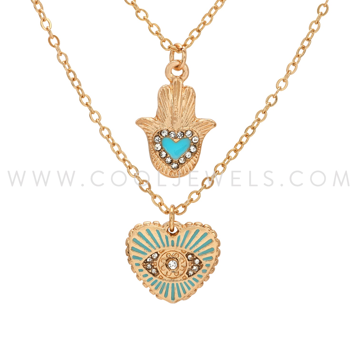 DOUBLE LAYER LINK CHAIN NECKLACE WITH HAMSA PENDANT AND HEART PENDANT