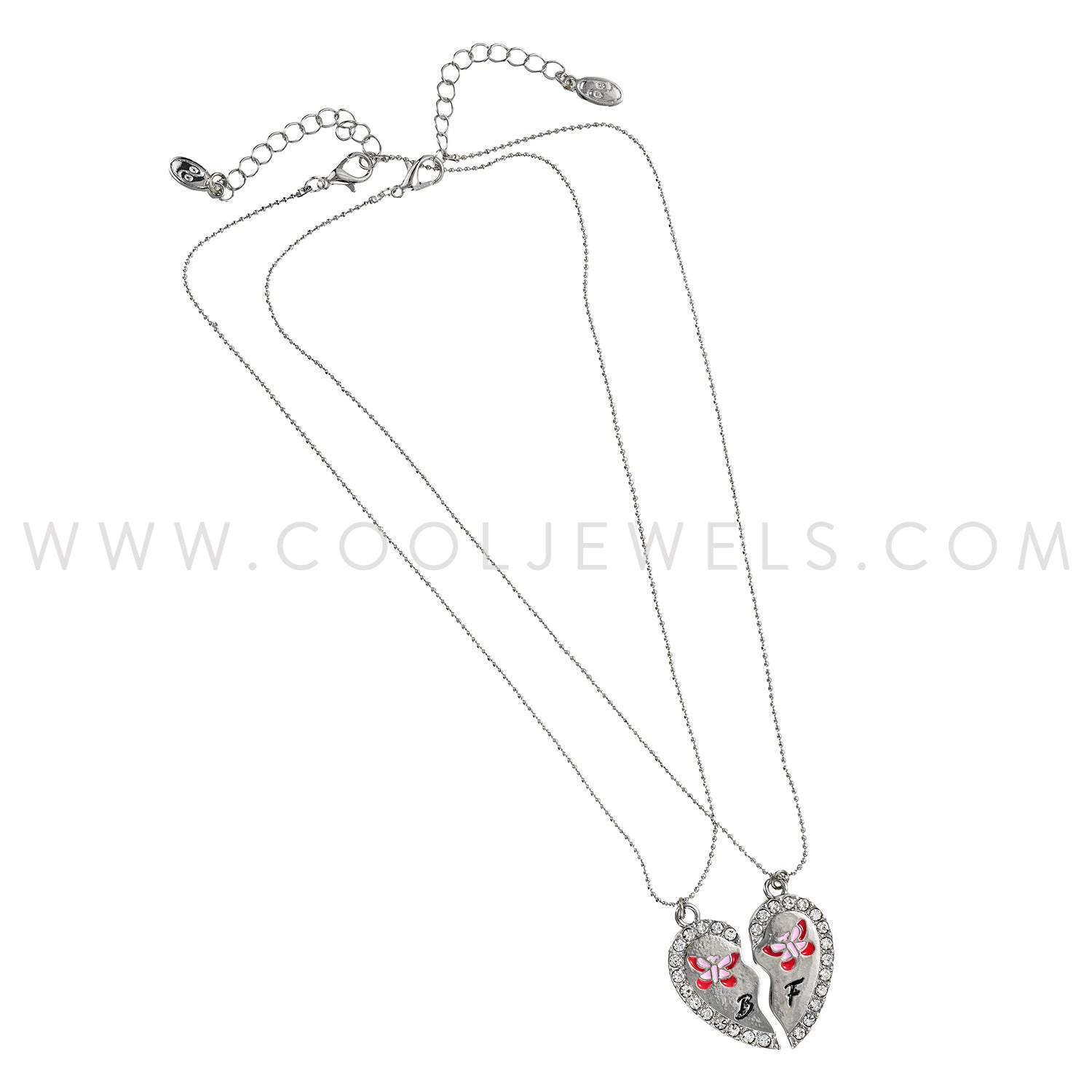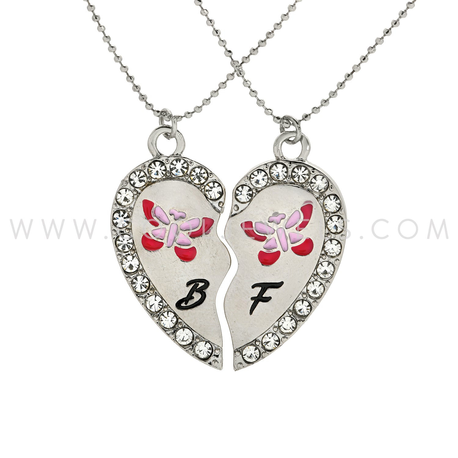 These Butterfly Rhinestone Best Friends Necklaces (2 Piece Set) feature a pair of rhinestone pendants that fit together to form a heart. The pendant reads either "B" and has a pink butterfly, or "F" and has a purple butterfly.