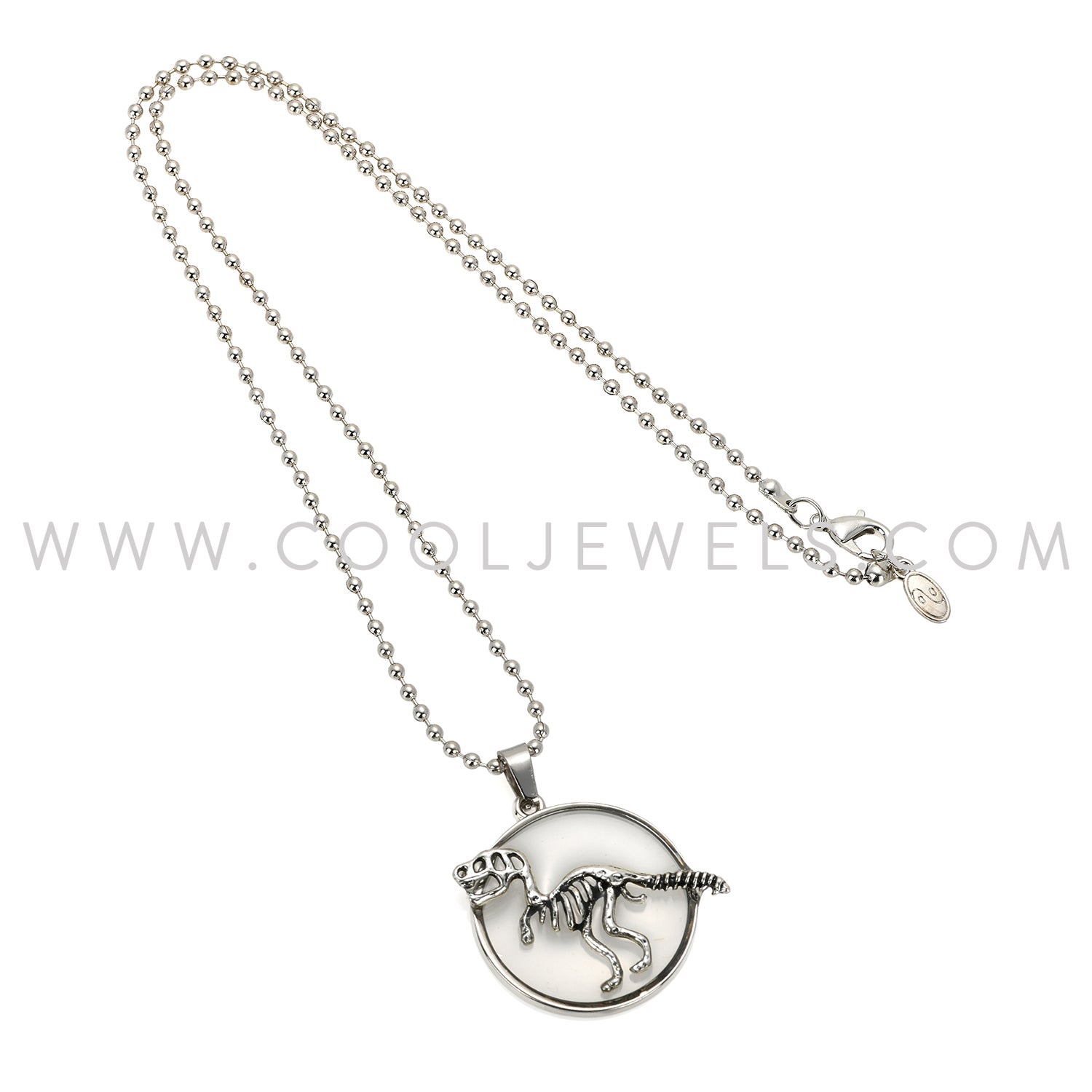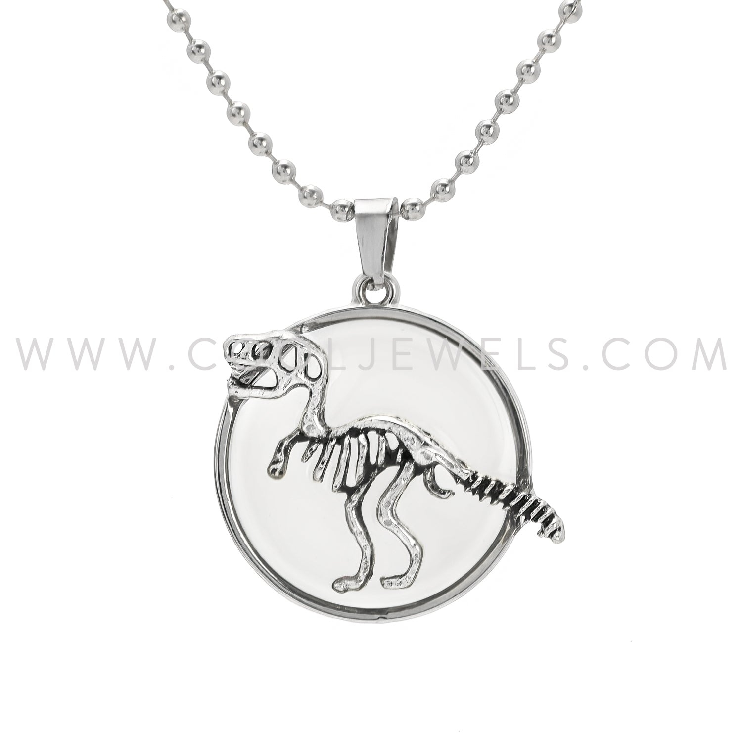 BALL CHAIN NECKLACE WITH CLEAR ROUND DINO SKELETON PENDANT