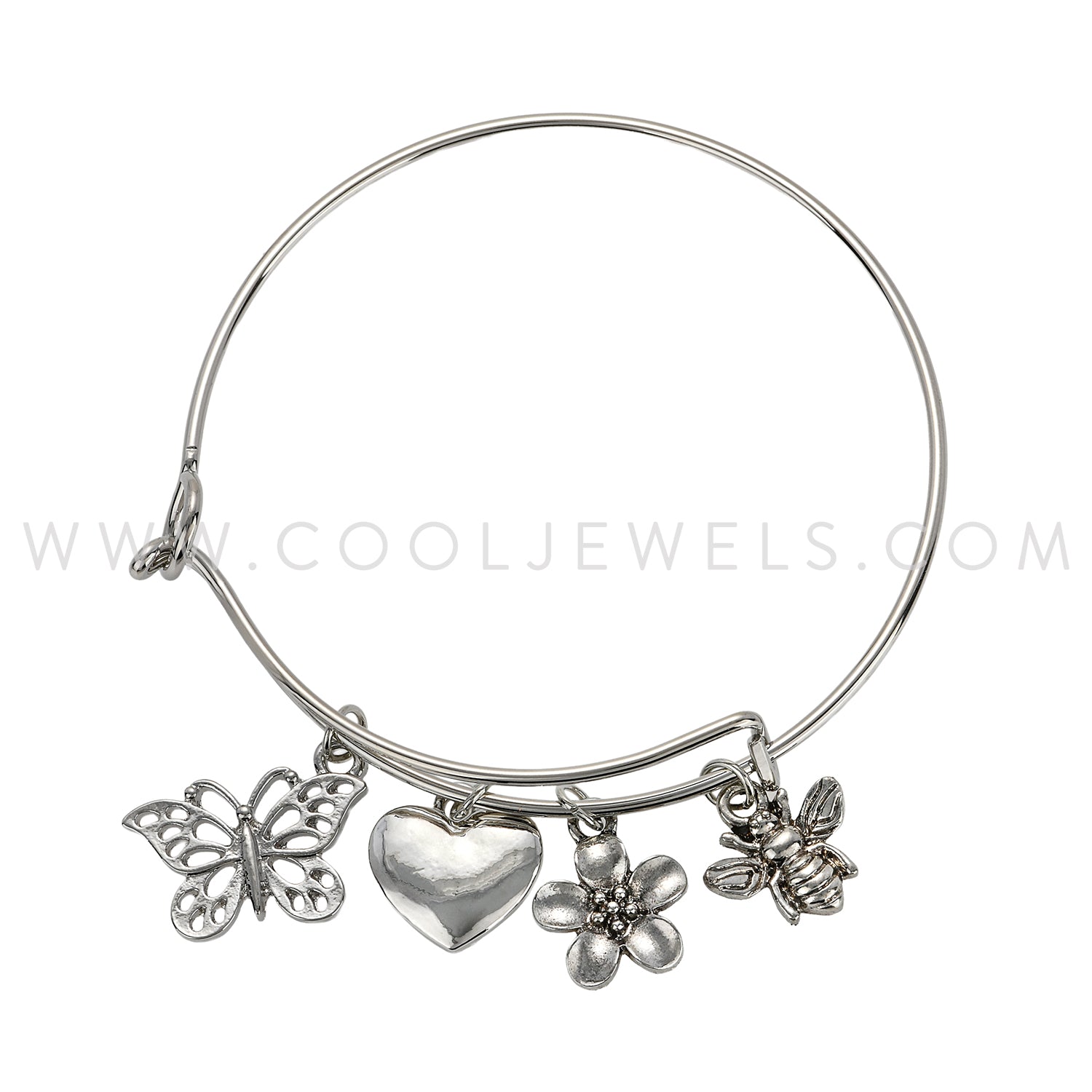 These Flower Heart Butterfly Silver Bangle Bracelets feature a variety of charms accented with a flower, butterfly, heart and bumble bee pendant.