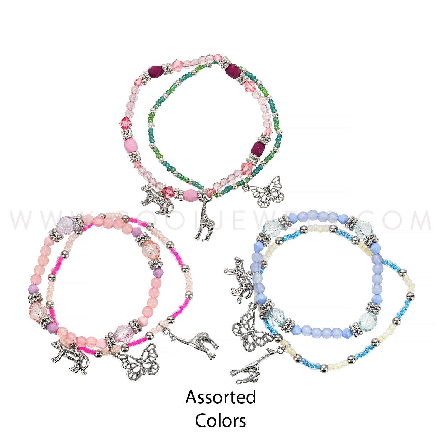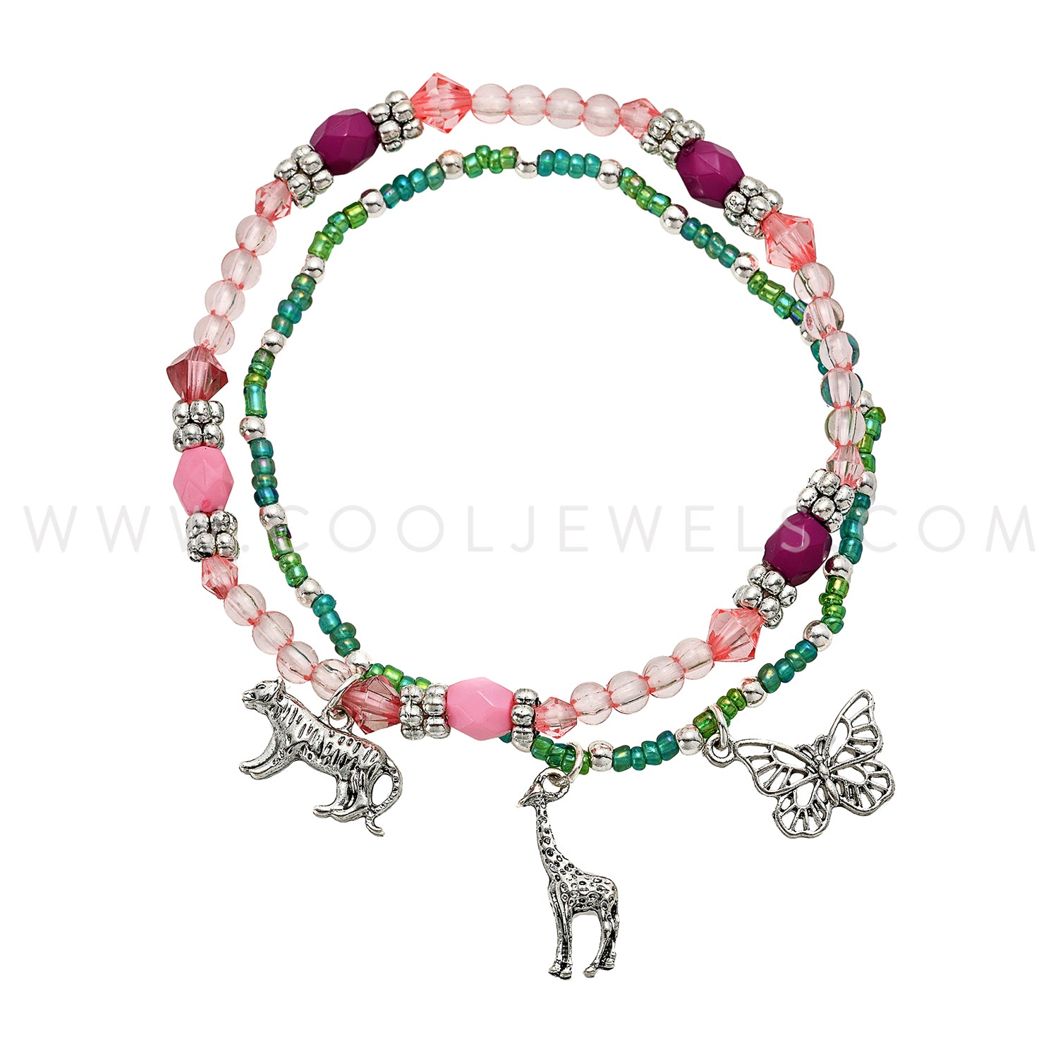 These wonderful (Set of 2) Animal Charm Stretch Bracelets feature two beaded stretch bracelets with a butterfly, giraffe, and tiger charms.