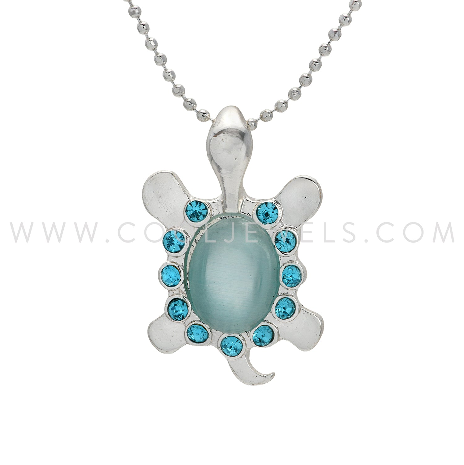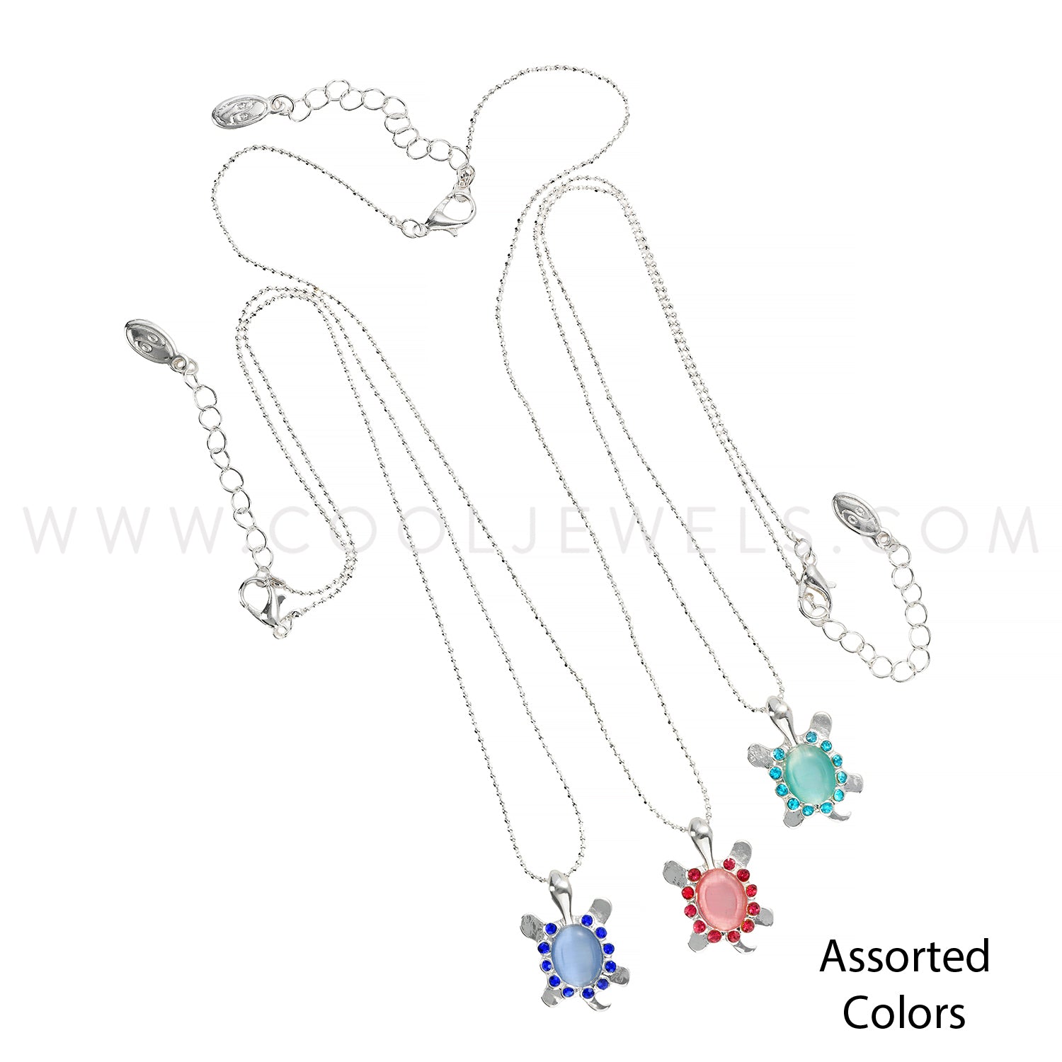 This Cat's eye & Rhinestone Turtle Necklace comes on a silver ball chain necklace and features a Cat's eye & Rhinestone Turtle Pendant. Each dozen comes in an assortment of pink, light blue, and green pendants.