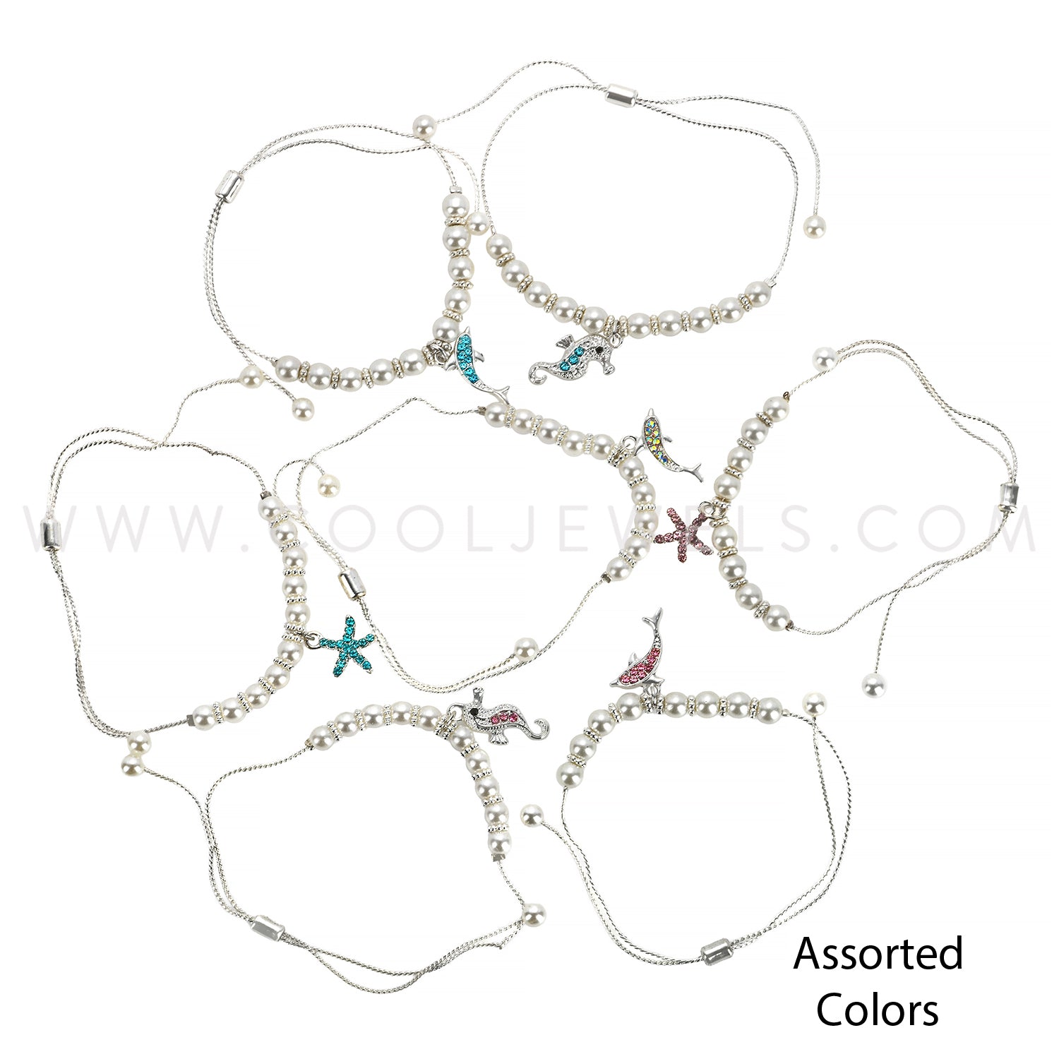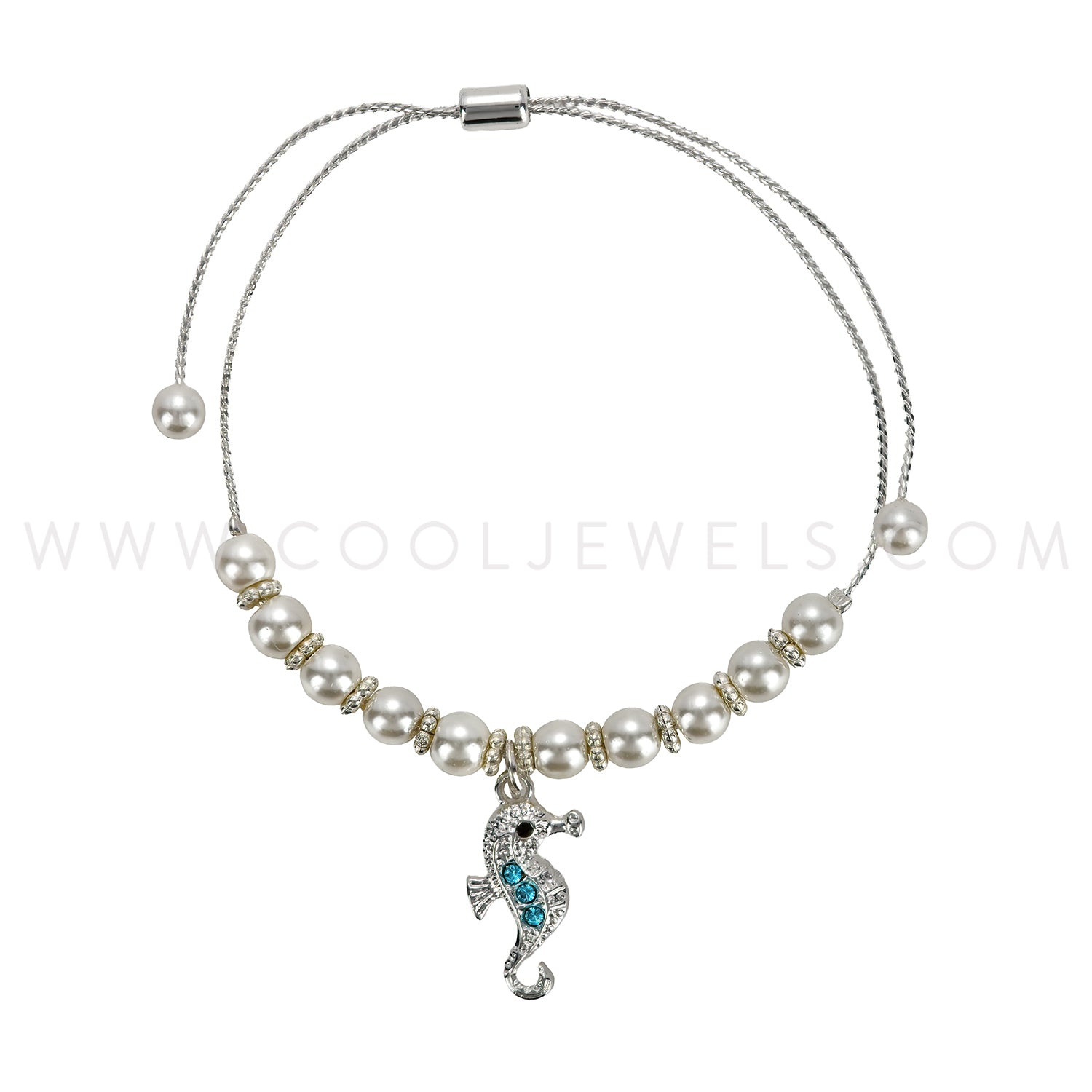 SILVER SLIDER BRACELET WITH WHITE BEADS & RHINESTONE SEALIFE CHARM