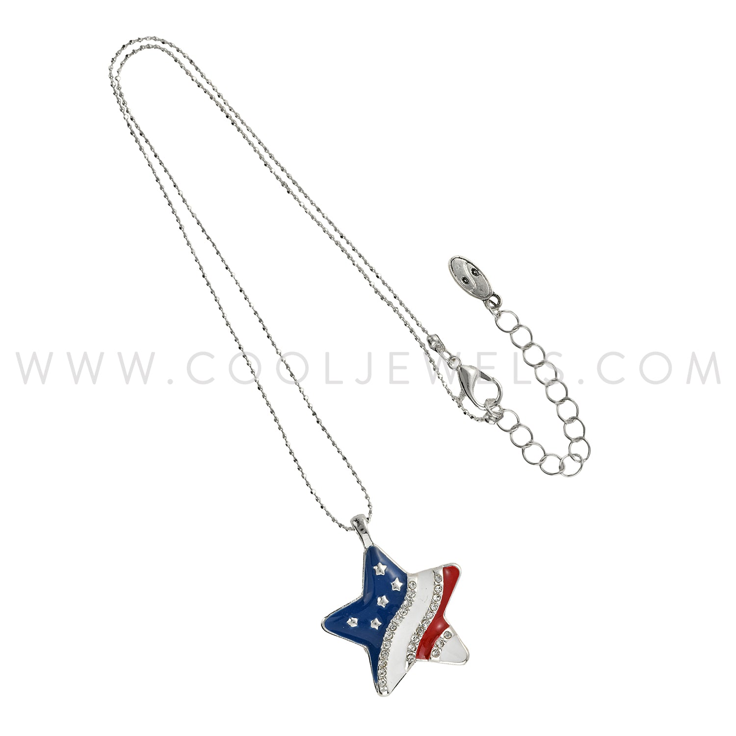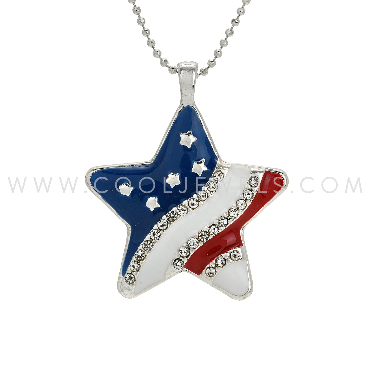 These Rhinestone Flag Star Necklace feature a silver ball chain with a silver star and American flag colored heart pendant accented with rhinestones.