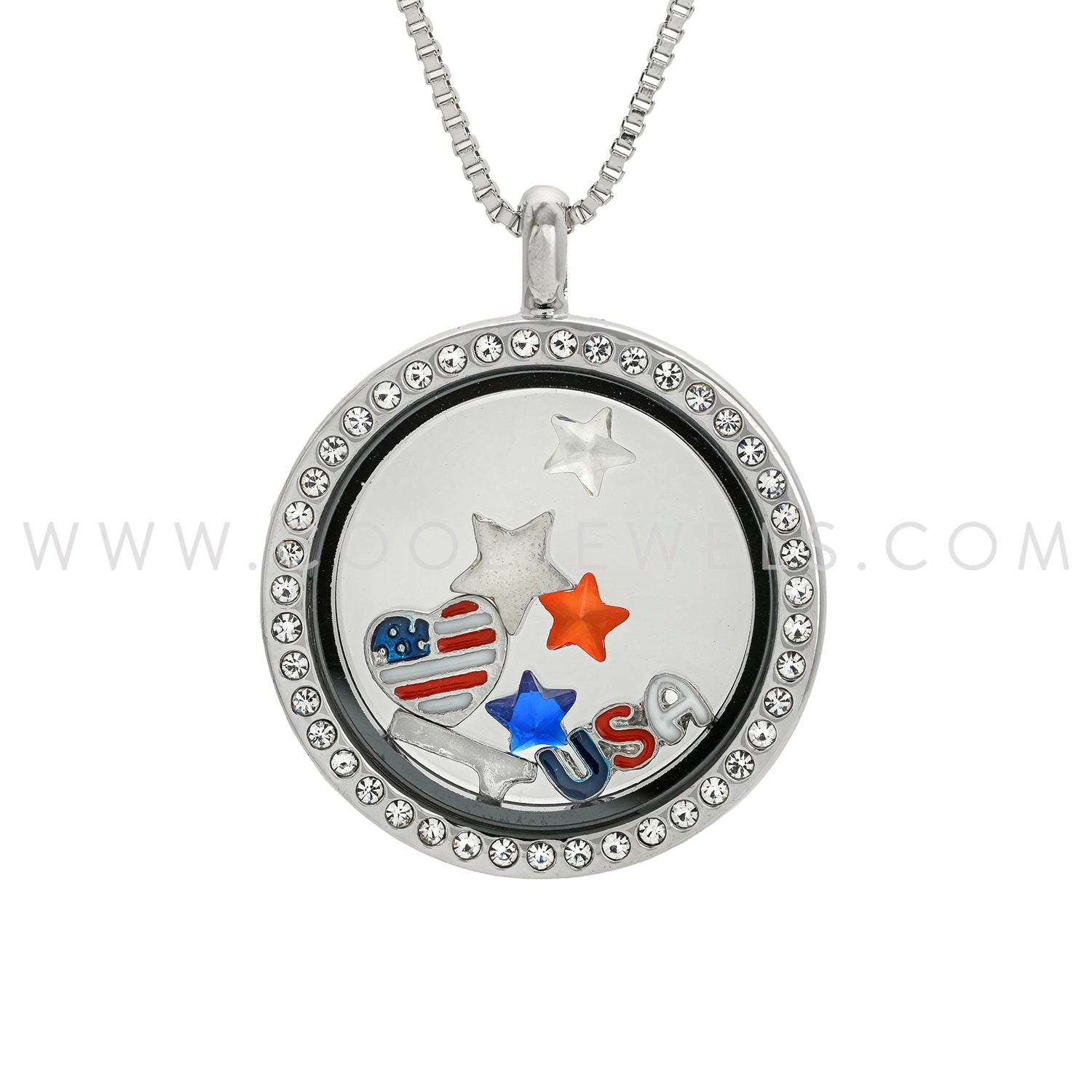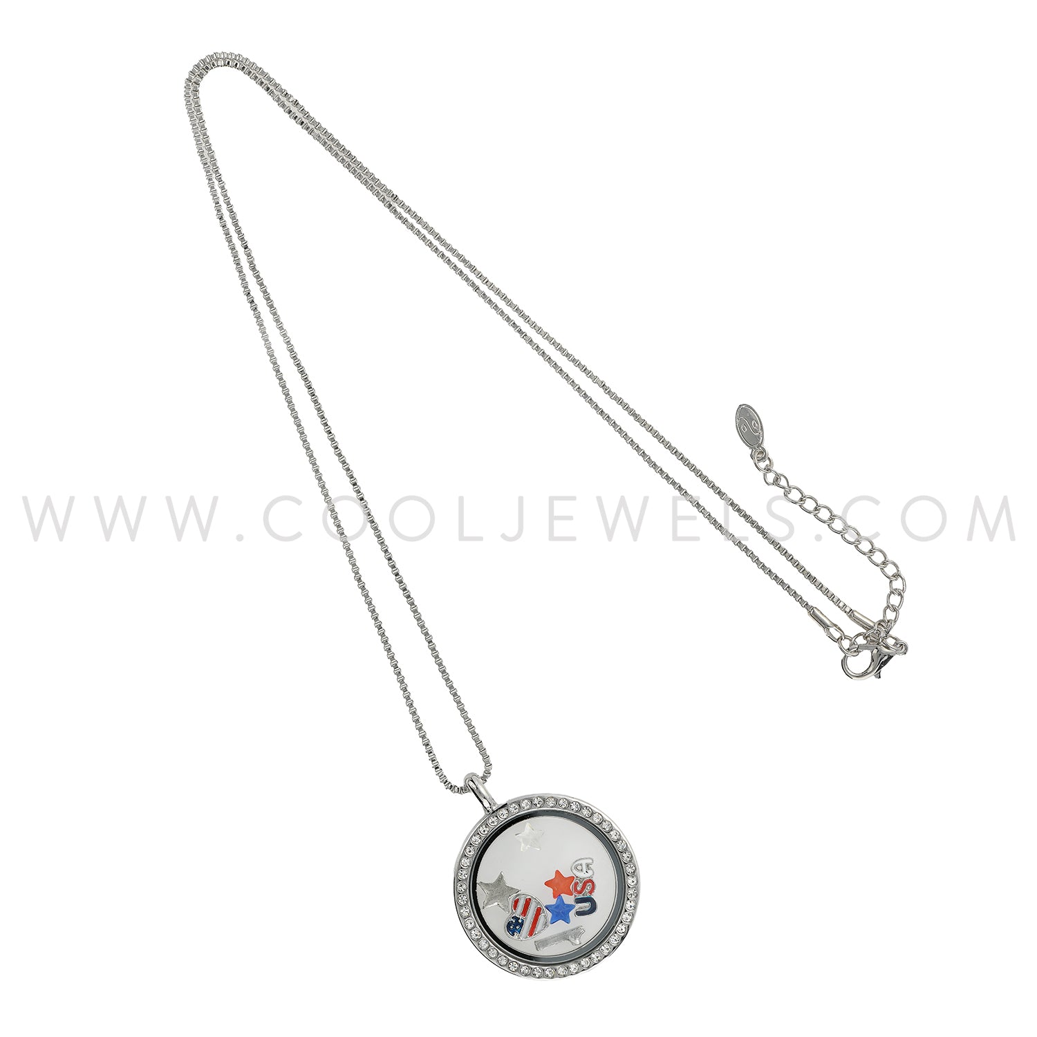 These Round Rhinestone American Themed Shadowbox Necklaces feature a round rhinestone encrusted American themed shadowbox pendant.