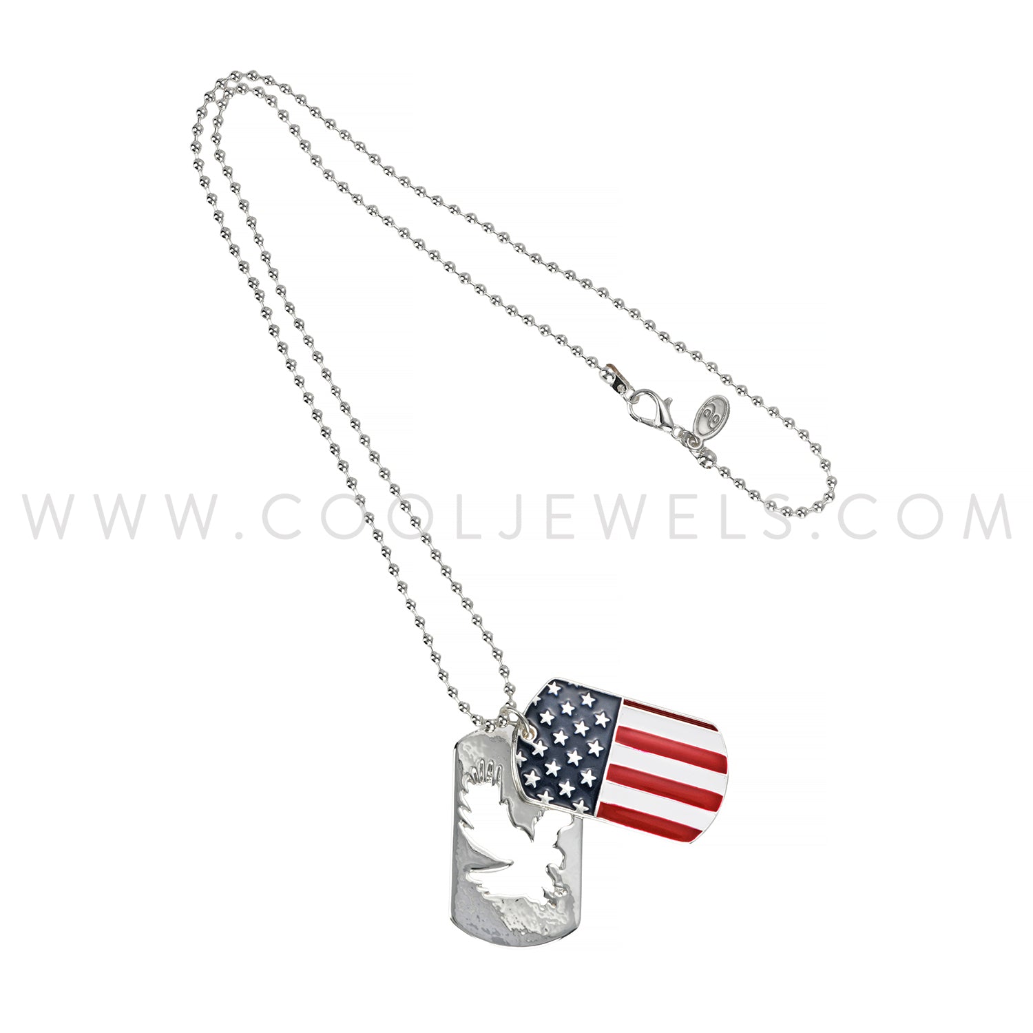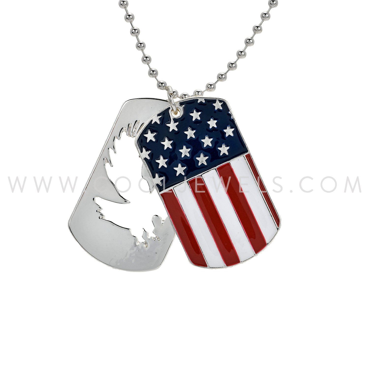 These awesome Eagle & American Flag Dog Tag Necklaces feature an eagle dog tag laid over top of an American Flag Dog tag, both suspended on a ball chain necklace.