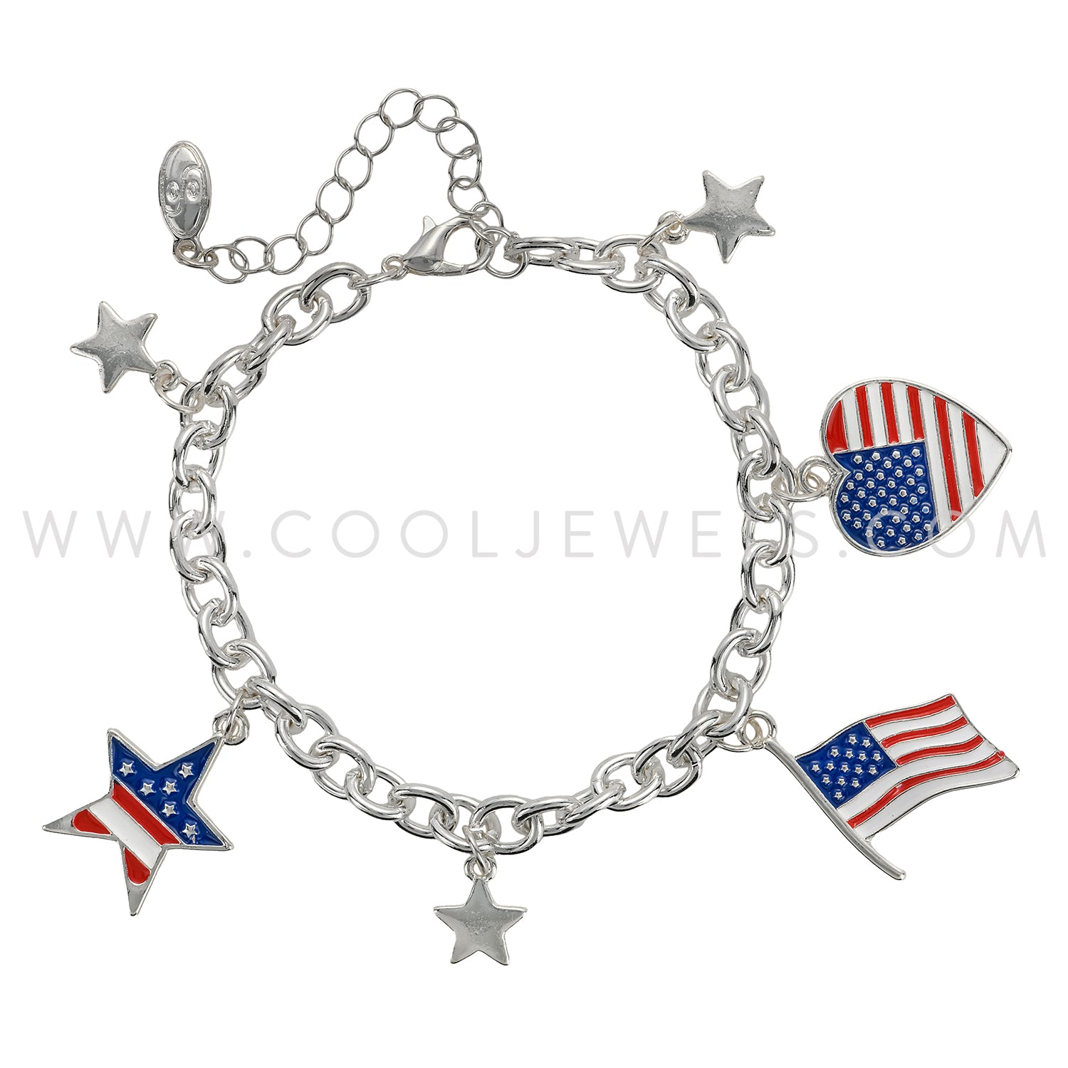 These American Flag,Heart and Stars Bracelet feature a variety of charms accented with an American Flag heart, stars and American Flag pendant.