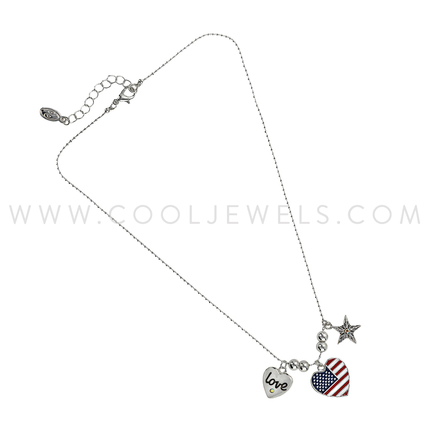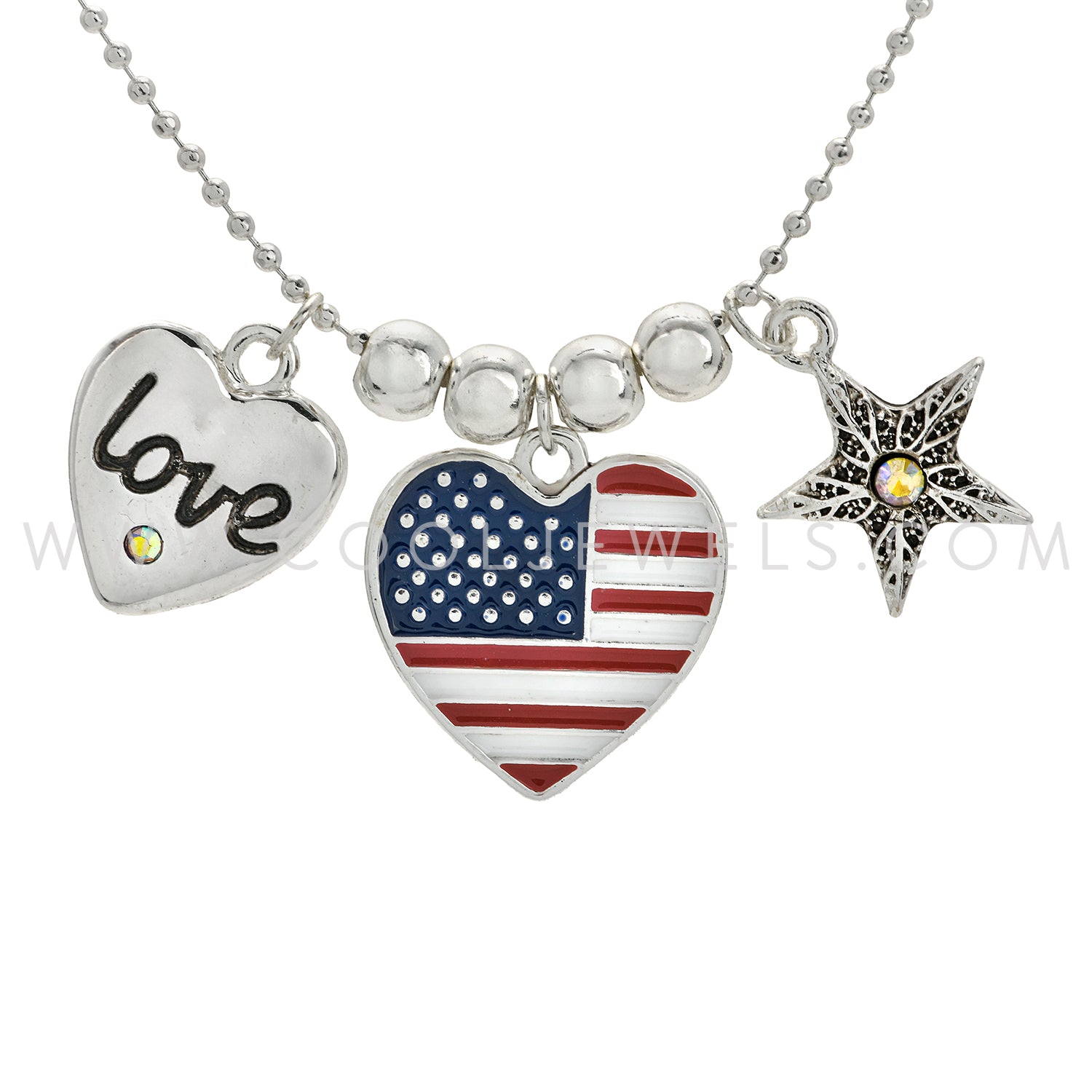 This Rhinestone Heart Shaped American Flag Necklace features a silver ball chain with a vibrant American colored heart shaped pendant with a 2 sided "love/USA" pendant.