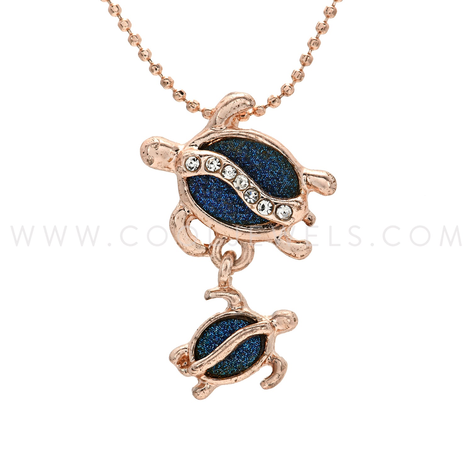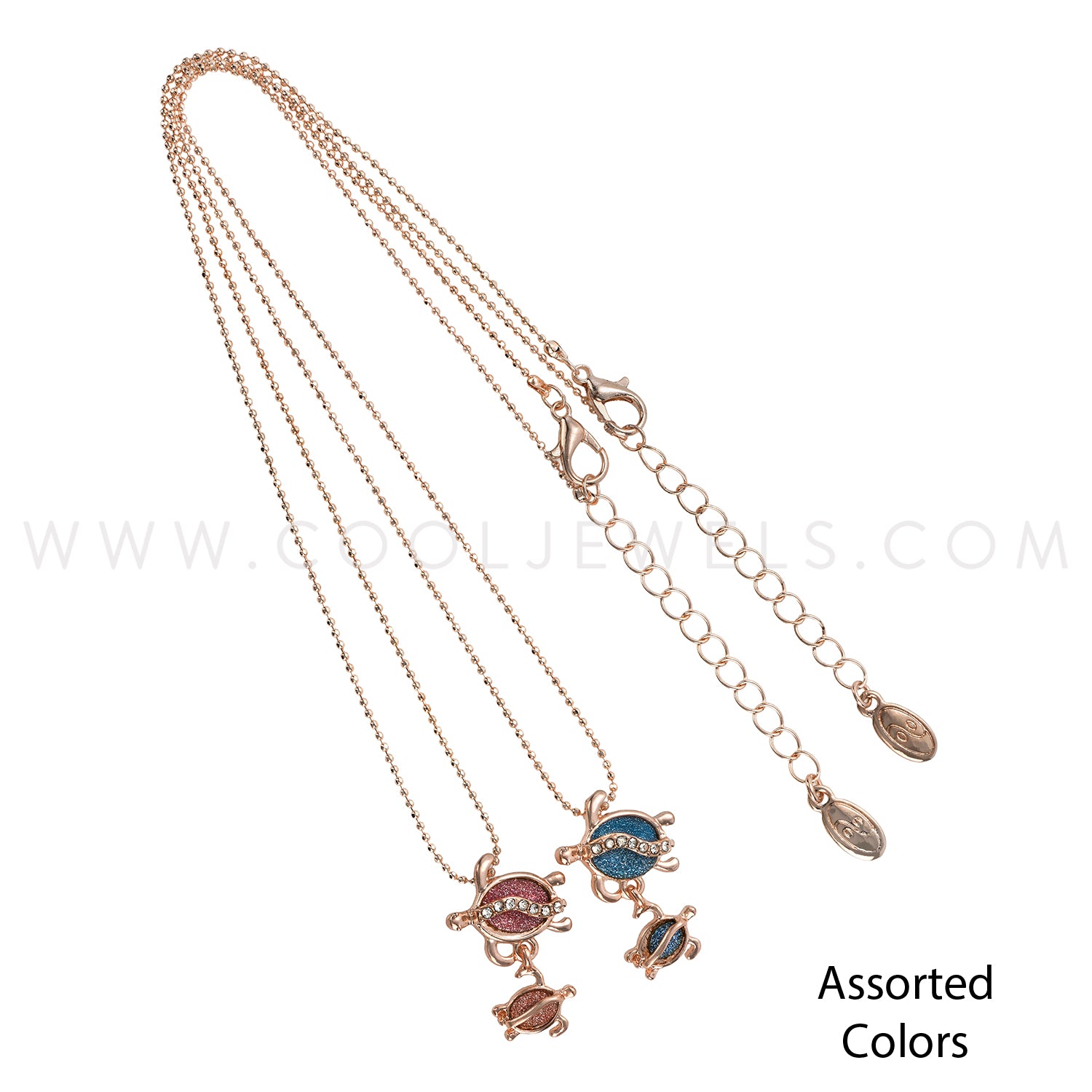 These gorgeous Assorted Color Rose Gold Glitter Glass Double Turtle Necklaces feature a lifelike double turtle sparkling enamel pendant.