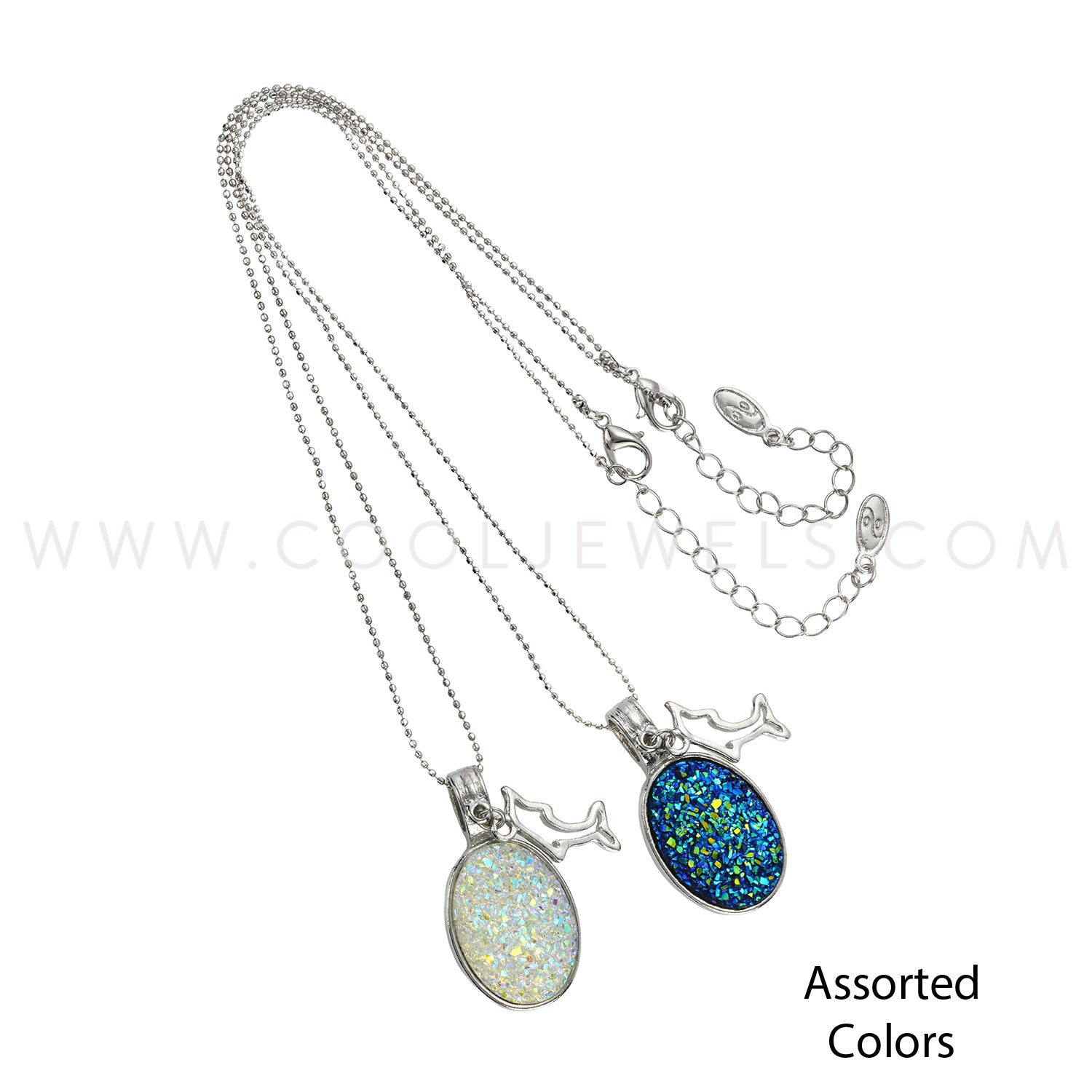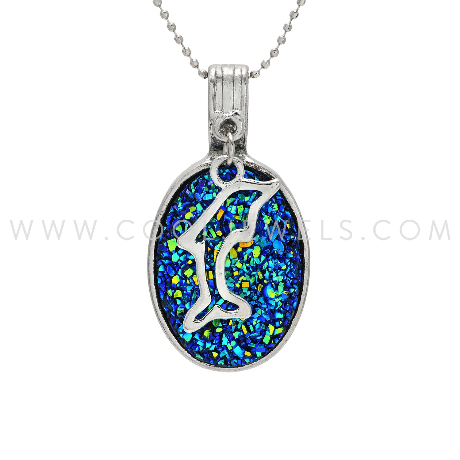 SILVER BALL CHAIN NECKLACE WITH OVAL STONE PENDANT & DOLPHIN CHARM