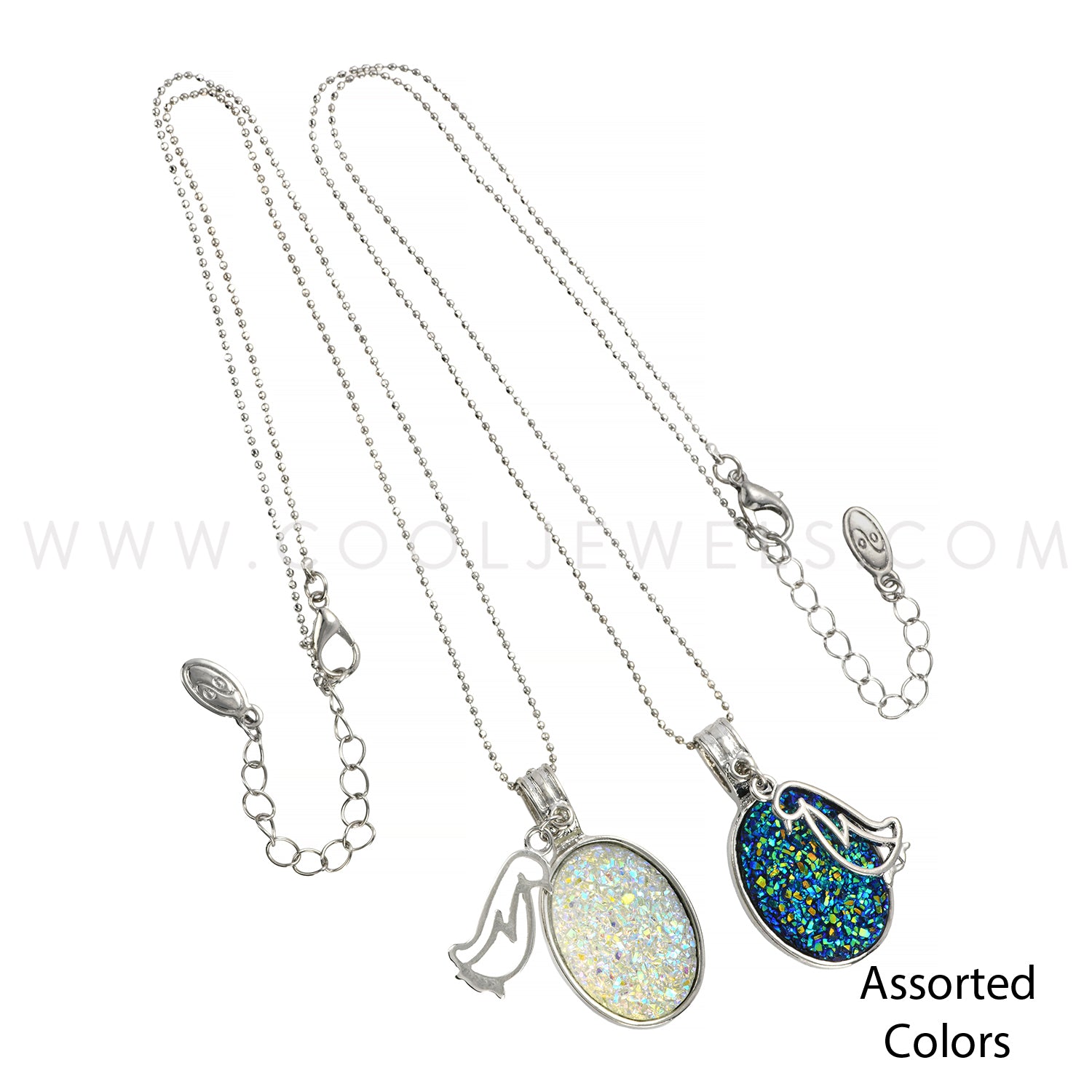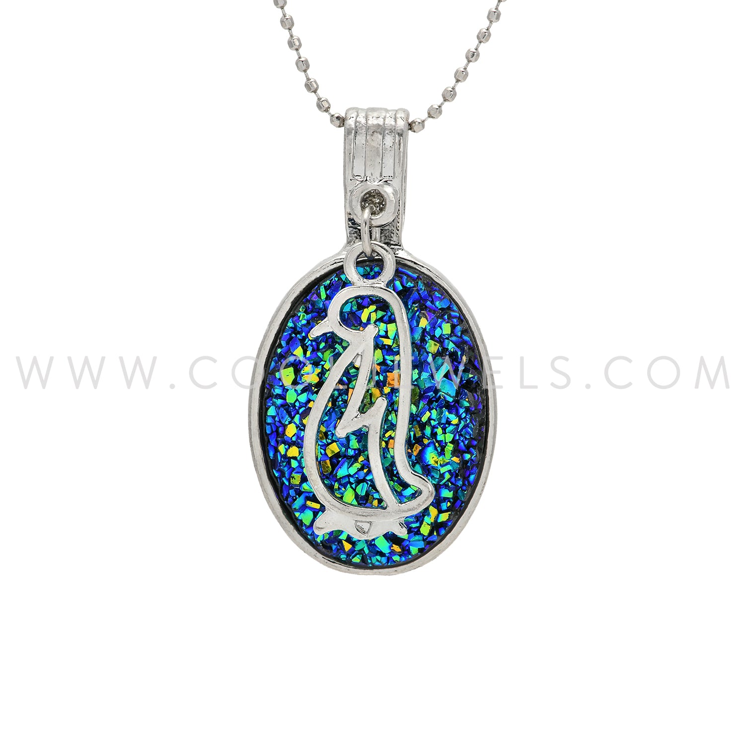 SILVER BALL CHAIN NECKLACE WITH OVAL STONE PENDANT & PENGUIN CHARM