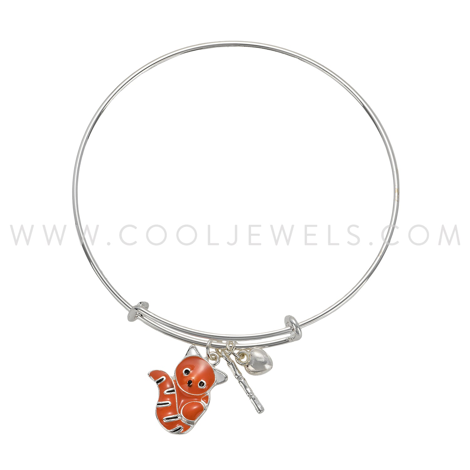 These adorable Red Panda, Bamboo & Heart Wire Bangle features a silver wire bangle with a red panda, bamboo, & heart pendants.