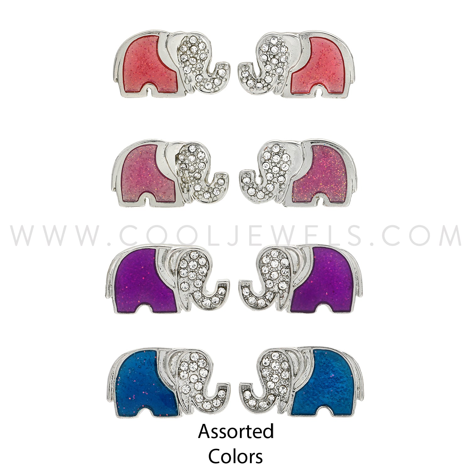 These Assorted Color Elephant Glitter Glass Earrings feature a glitter enamel colored elephant pendant with rhinestones. Each dozen contains assorted colors.